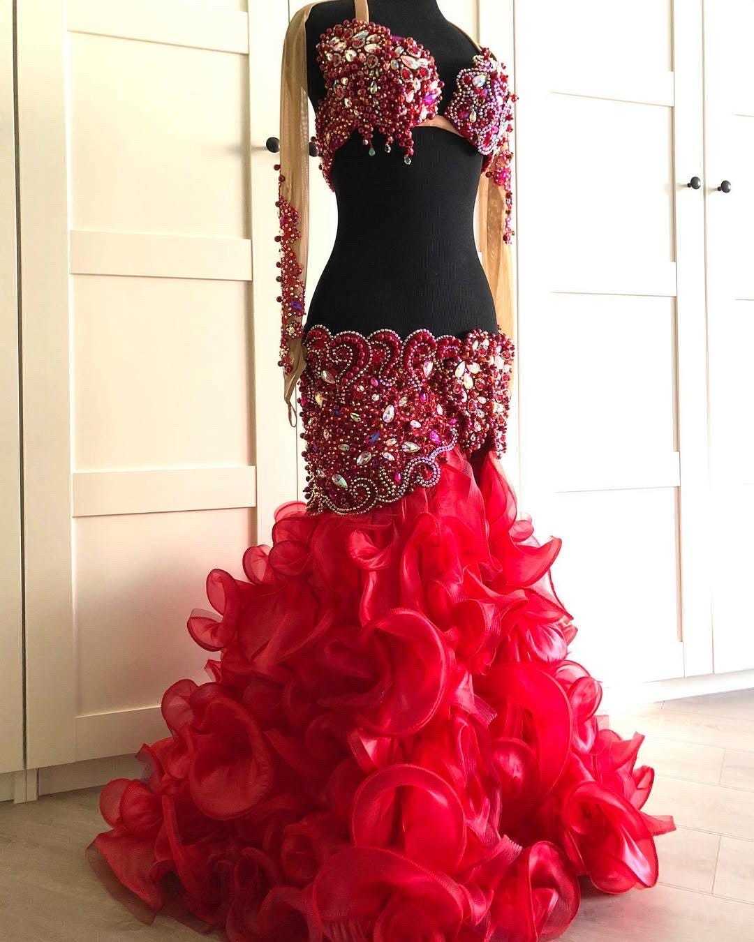 Made to Order Red Rhinestone Belly Dance Costume: Professional Performance Dress