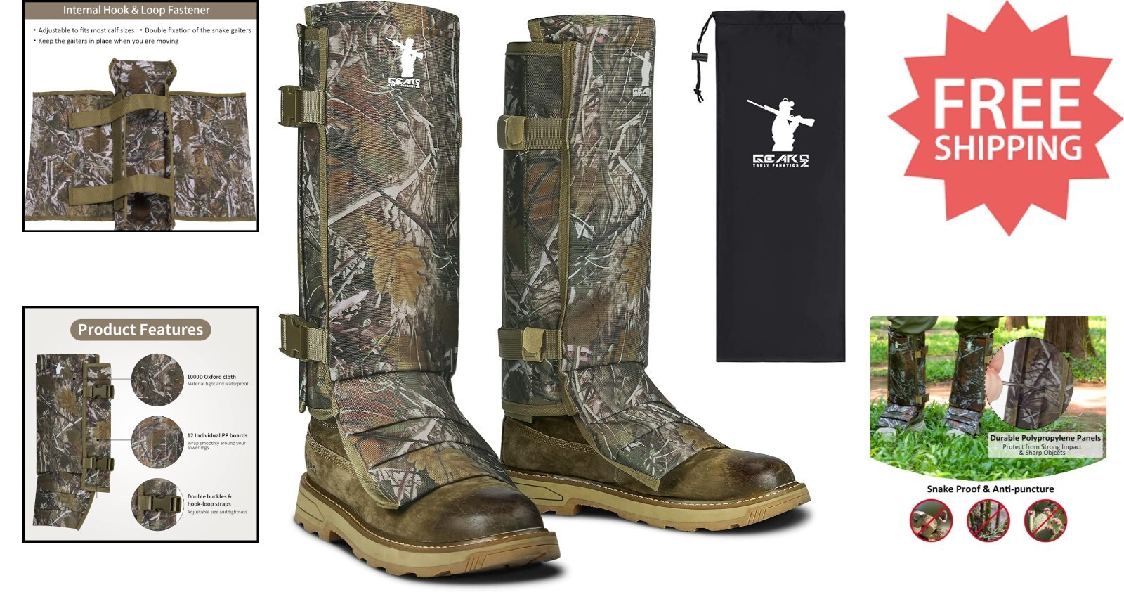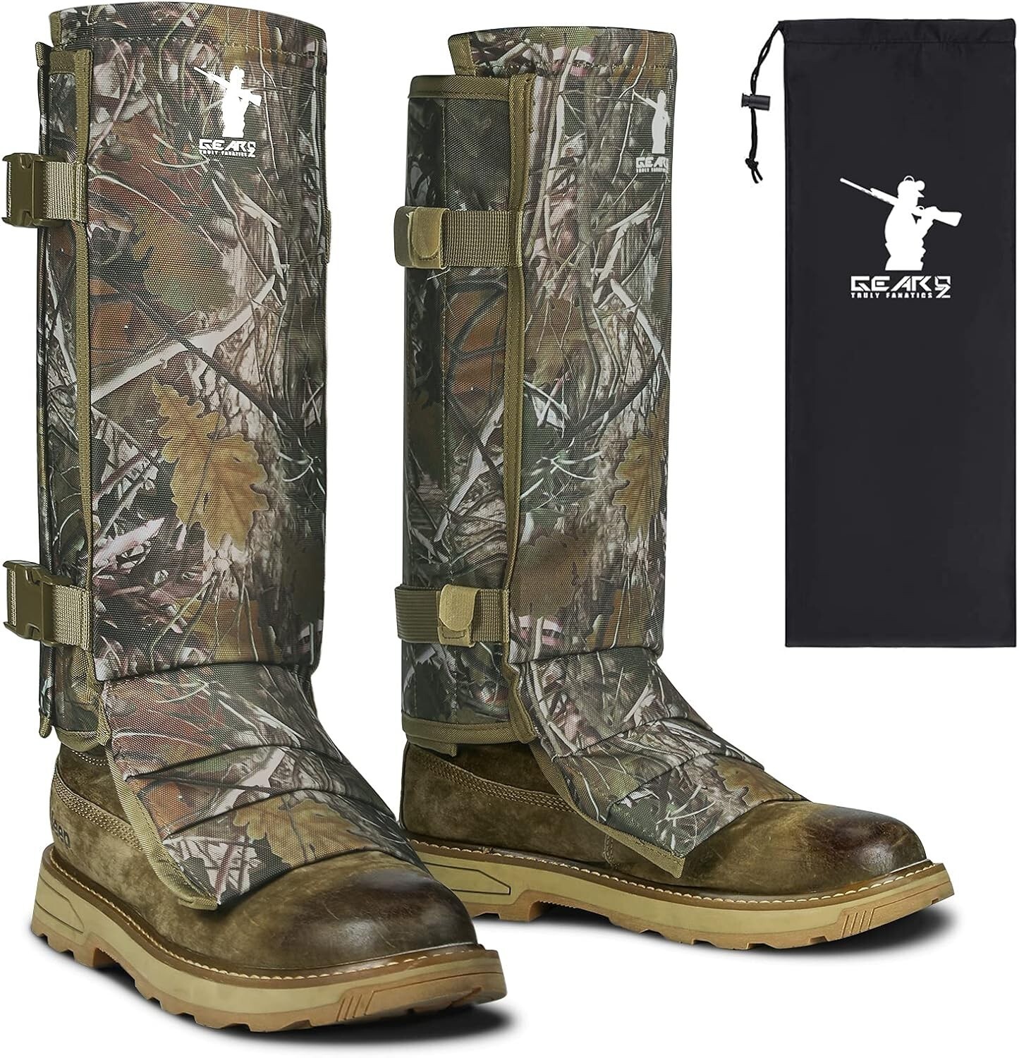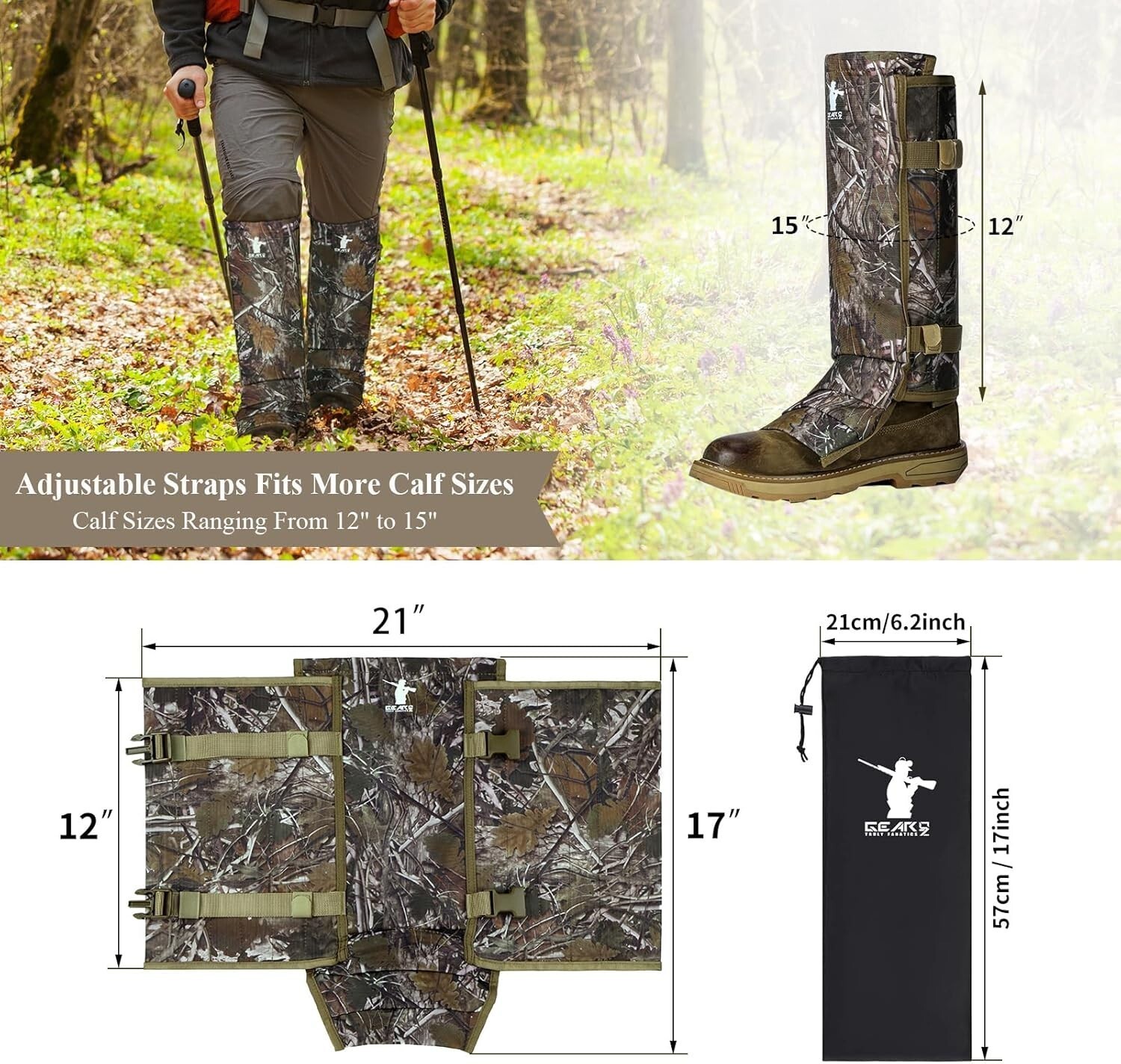 Experience ultimate protection and comfort with GearOZ Snake Gaiters. Crafted from durable 1000D Oxford material and reinforced with 12 polypropylene boards, these gaiters offer robust defense against snake bites and thorns. The enhanced design features adjustable straps, buckles, and elastic loops, ensuring a secure fit for calf sizes from 12" to 18". Waterproof and lightweight at just 13 oz per pair, they efficiently keep your legs dry and breathable in challenging environments. Ideal for outdoor activities like hunting, camping, hiking, and trekking, these gaiters are a reliable essential for your adventure gear. They can be easily folded into the included storage bag for portability. Made for durability, comfort, and versatility?your perfect outdoor companion.