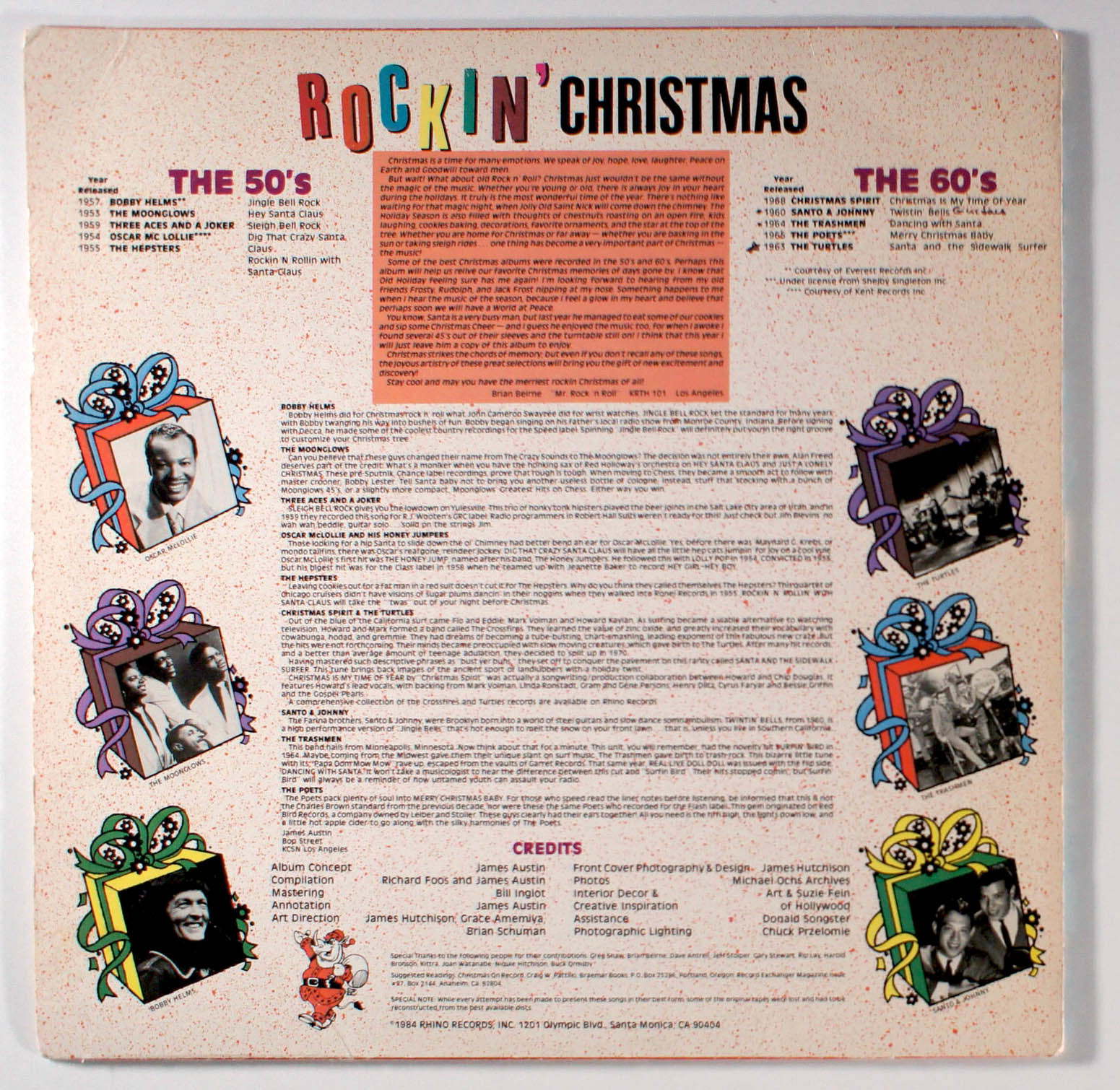 Rockin' Christmas, released in 1984 by Rhino Records as a Good Guys special collector's edition, is a compilation of vintage Christmas songs from the 1950s and 1960s, showcasing a vibrant mix of rock 'n' roll, doo-wop, and rockabilly styles. This album, split into two sides dedicated to each decade, features rare and idiosyncratic tracks that capture the eclectic energy of early rock music, including rhythm and blues and novelty records. Historically significant as one of the first reissues of vintage Christmas music, it played a pivotal role in sparking interest in holiday rock 'n' roll and influenced subsequent Rhino compilations. A notable hit single from the album is Bobby Helms' Jingle Bell Rock (1957), a chart-topping classic that remains a holiday staple, certified Gold by the RIAA with over 780,000 digital downloads. Other standout tracks include The Moonglows' Hey Santa Claus and Three Aces A Joker's Sleigh Bell Rock, though they did not achieve the same commercial