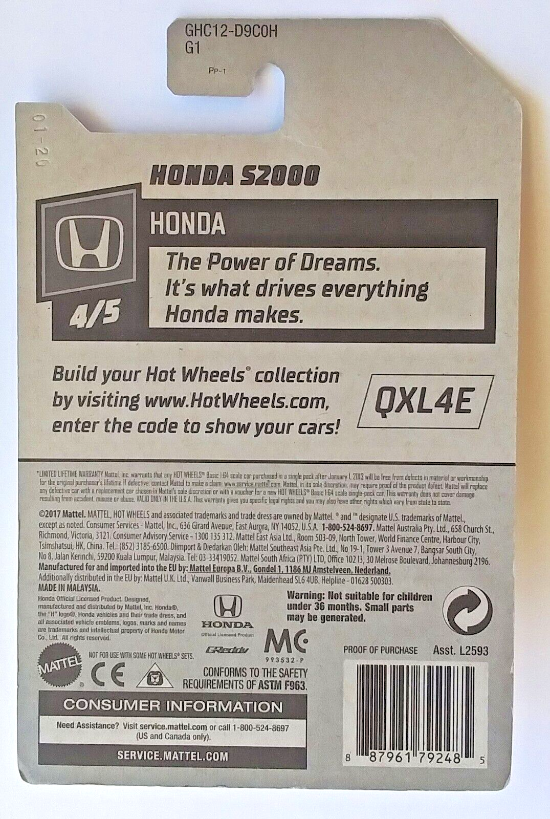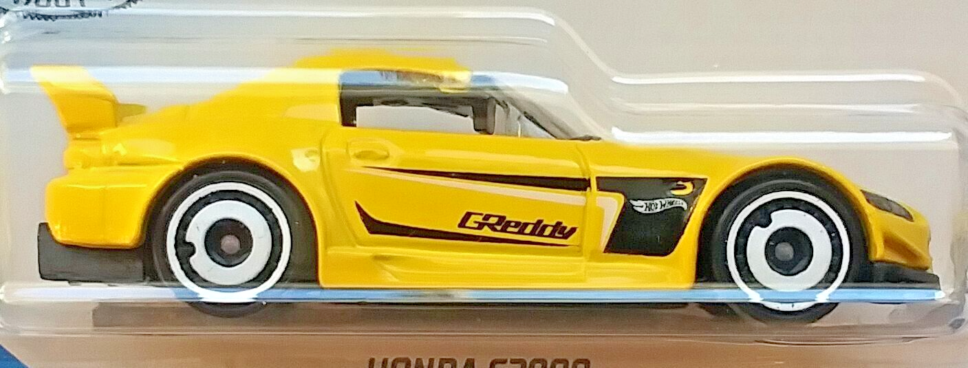 This is a new, still on card condition Honda S2000 Sport Coupe from Hot Wheels. This is a bright yellow edition with black and white wheels, from 2017. The card shows some minor storage wear around the edges, but the car inside is