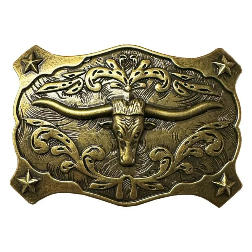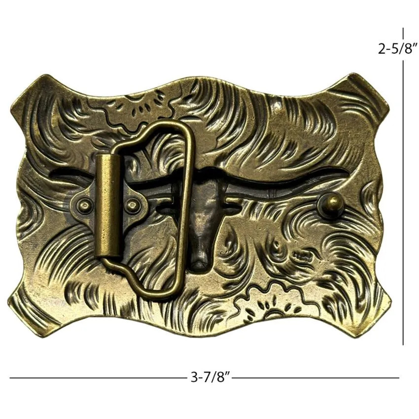 The New Golden Design Bull Horn Belt Buckle is a solid brass buckle with a western style design, featuring a unique bull theme. It is designed specifically for men's belts with a width of 1.5 inches, adding a touch of accent to the outfit. The golden color and intricate details make it a stylish and eye-catching accessory for any wardrobe.