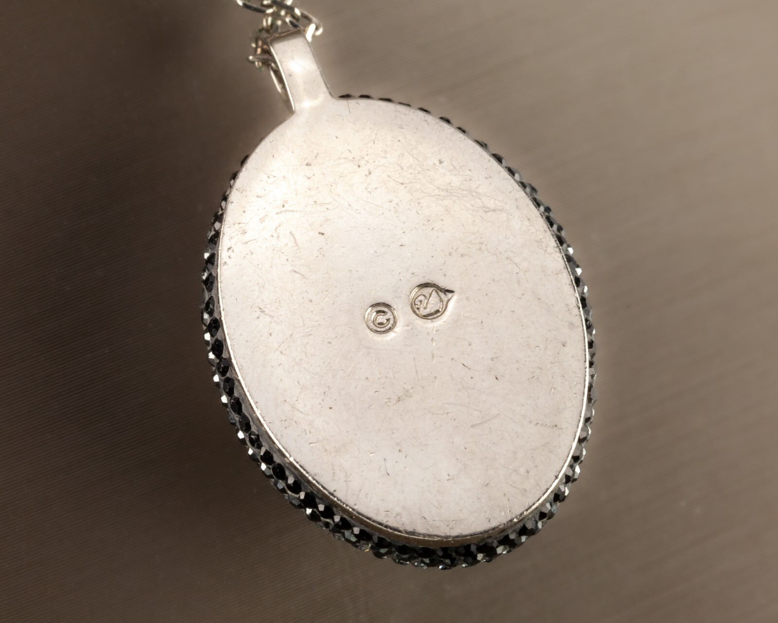 Pendant is in Good Pre-Owned Condition. A few minor flea bites on main stone. Some scratches on reverse of pendant. No apparent missing crystals in bezel. See photos for details.