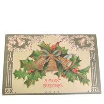 Postcard Merry Christmas Holly Snow Bells Gilded German Embossed Unposted