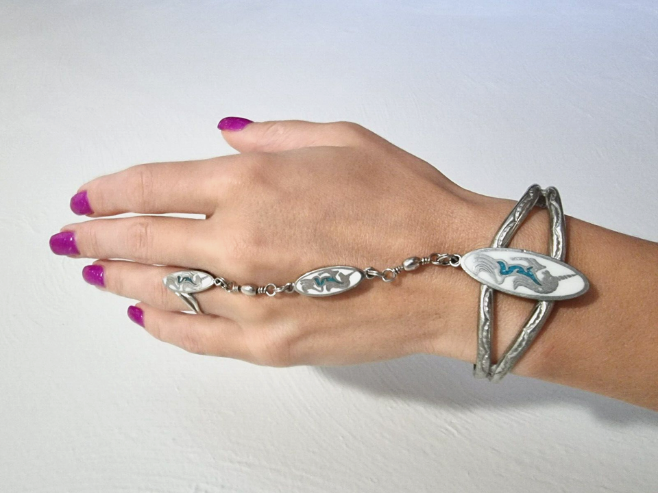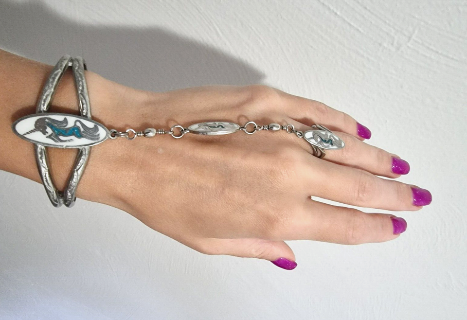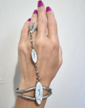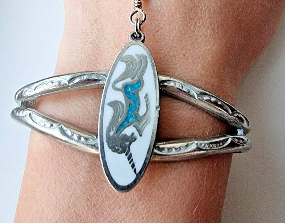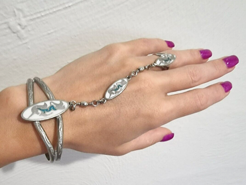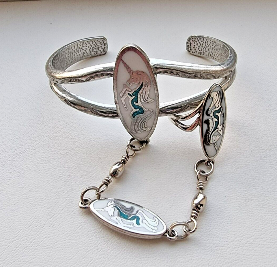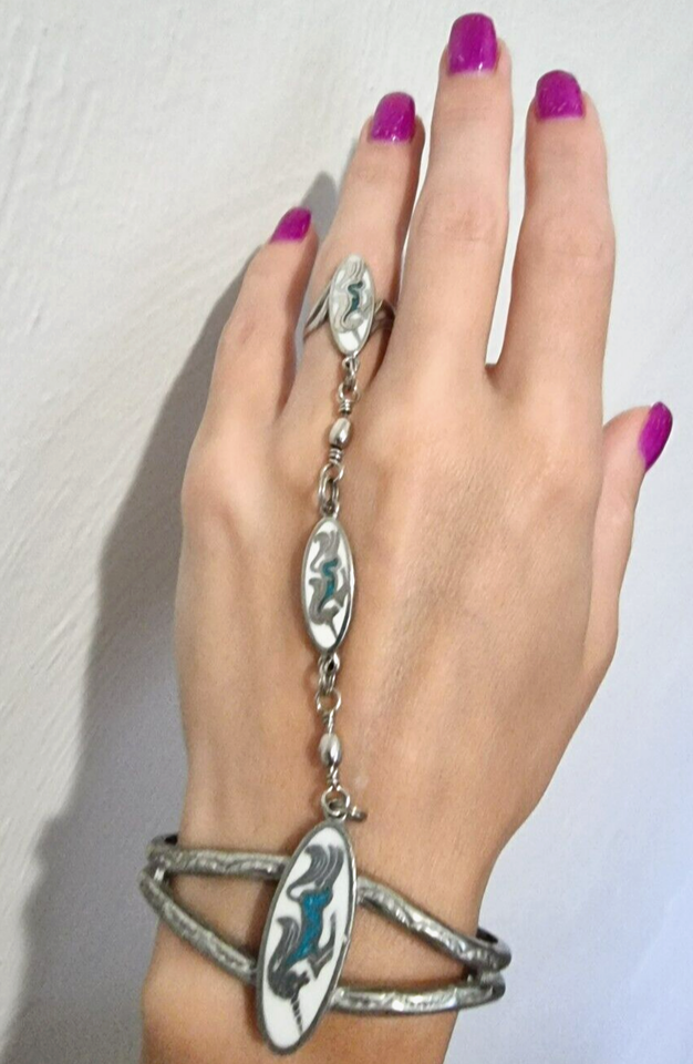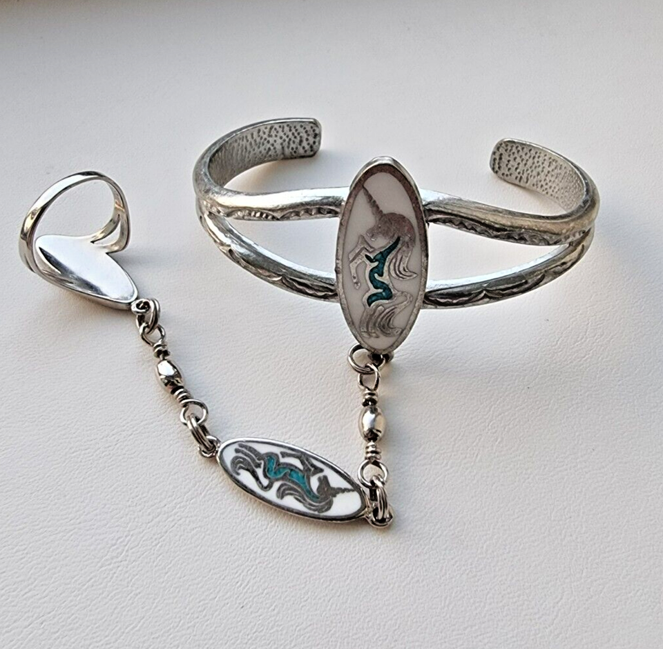 925 STERLING SILVER TURQUOISE AND ABALONE UNICORN CUFF BRACELET CHAINED RING