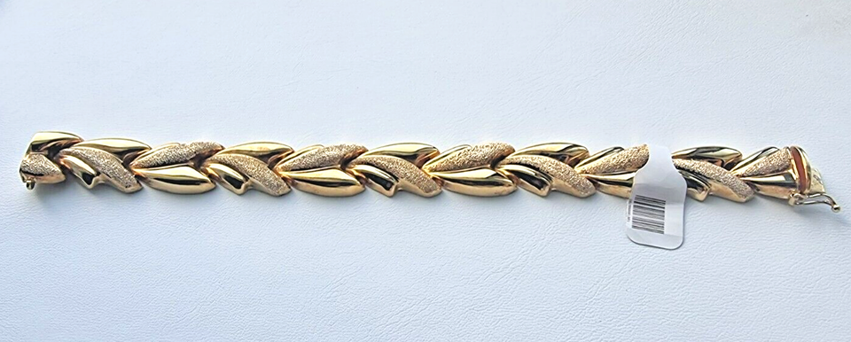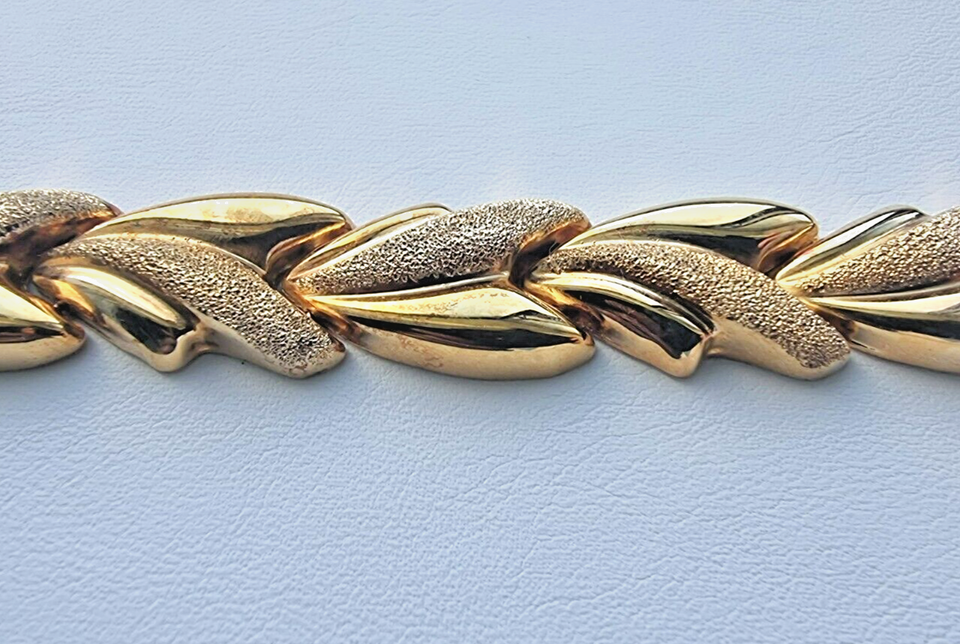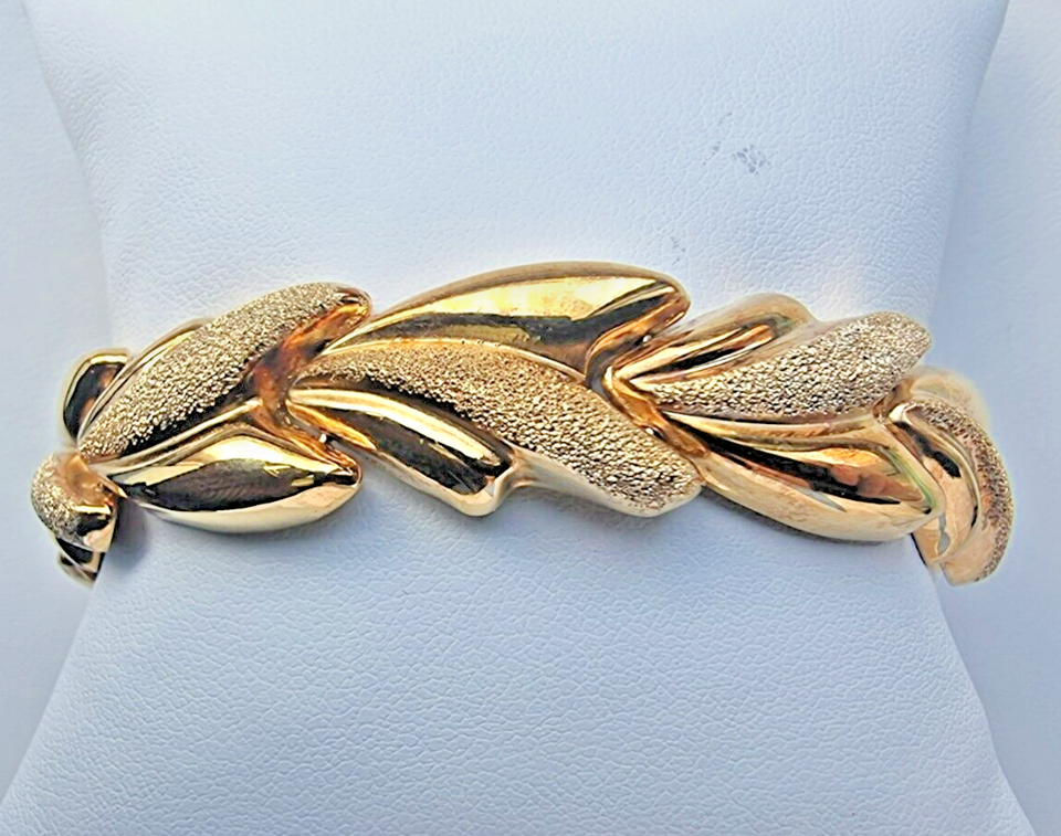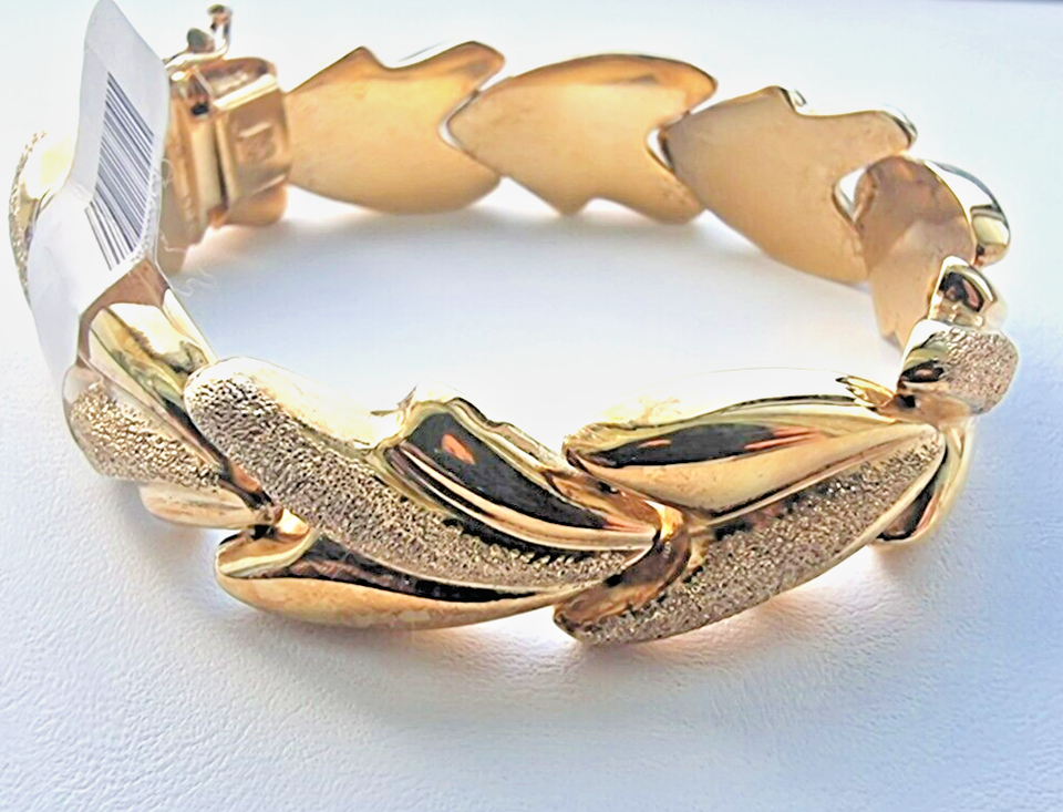 The bracelet is signed and has no stones, making it perfect for those who prefer simple yet chic jewelry. The beauty theme of this bracelet makes it an excellent gift for a loved one or a treat for yourself. Don't miss out on this piece of fine jewelry that is sure to make a statement.
