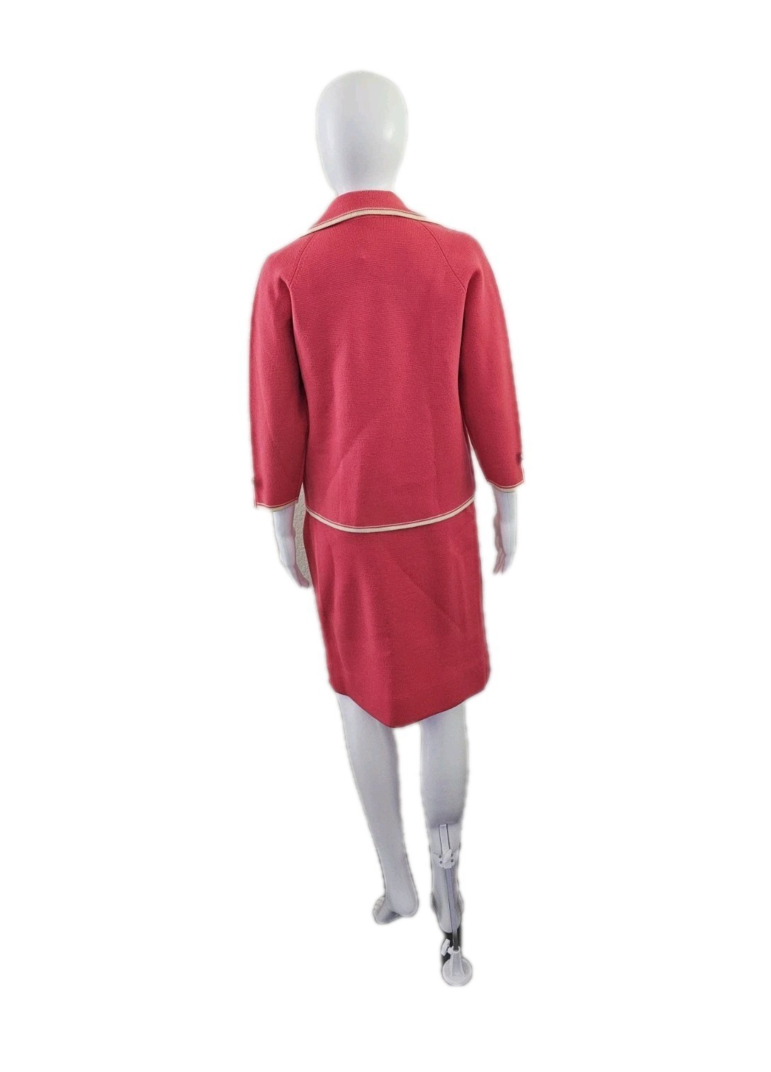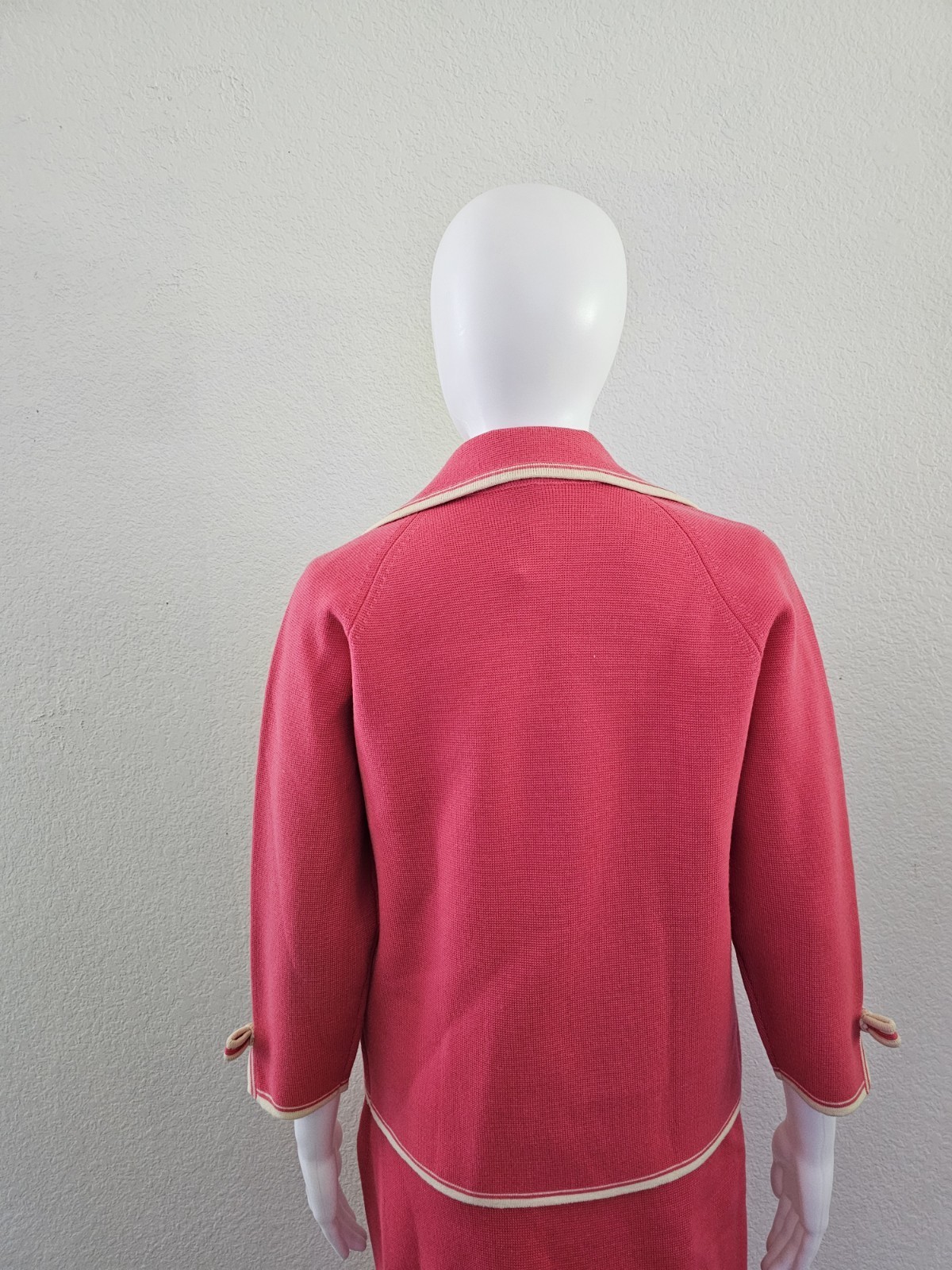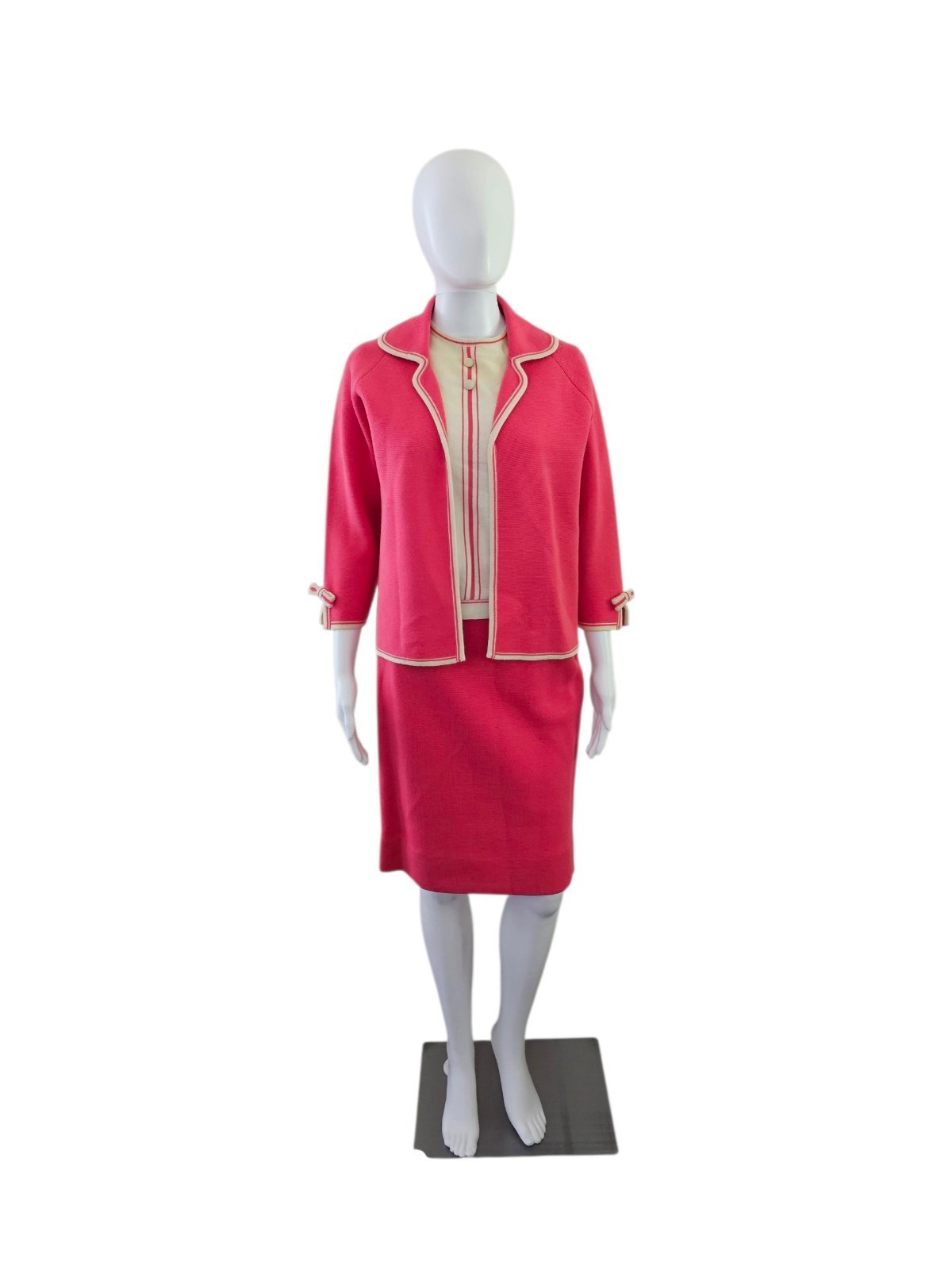 Vintage 1960s Madman Wool Knit Pink Skirt, Top And Jacket Bow