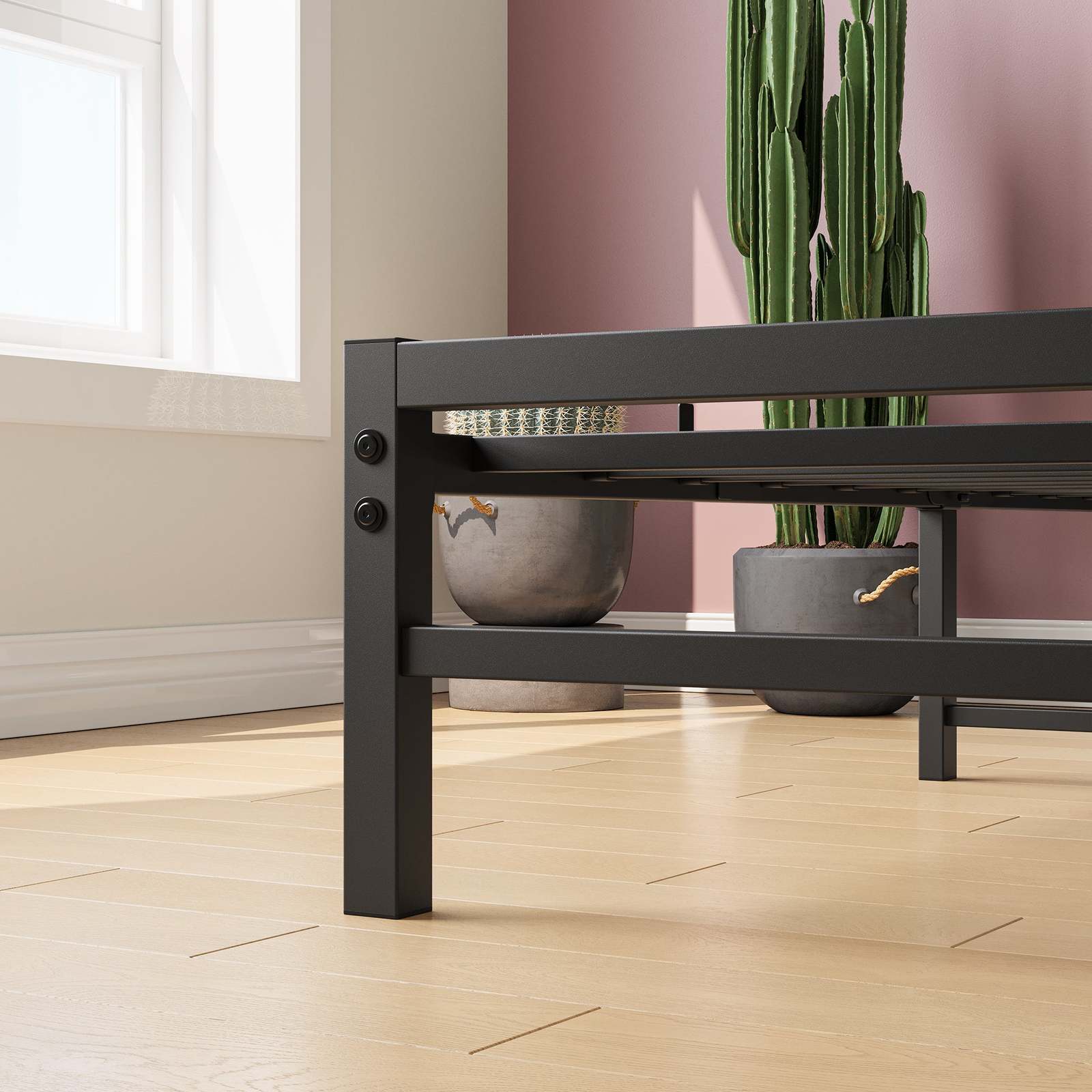 ?Enhanced Storage Capacity?This metal bed frame boasts a generous 10.6-inch under-bed storage area, significantly enhancing the efficiency of space utilization in your bedroom. It provides ample room for neatly storing luggage, shoes, seasonal items, and a wide range of other belongings. With this convenient storage solution, you can maintain a clean, clutter-free appearance in your bedroom
