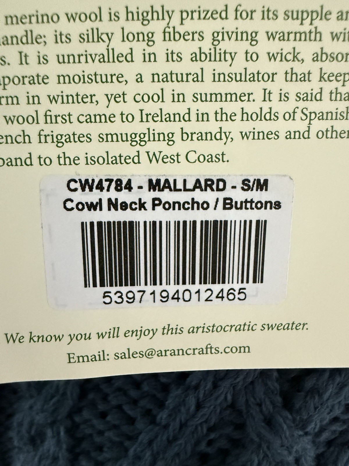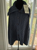 Aran Crafts Cable Knit Cowl Neck Poncho Sweater Women’s Merino Wool w/Buttons