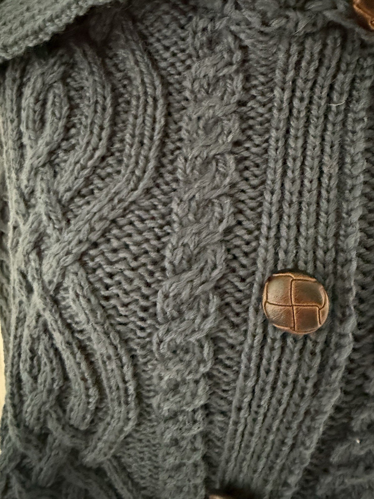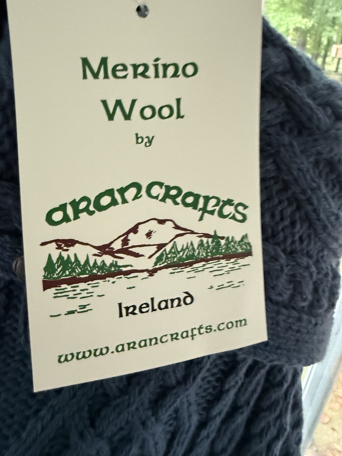Aran Crafts Womens 100% Merino Wool Mallard color, which is a beautiful blue color. Buttons all the way. New!