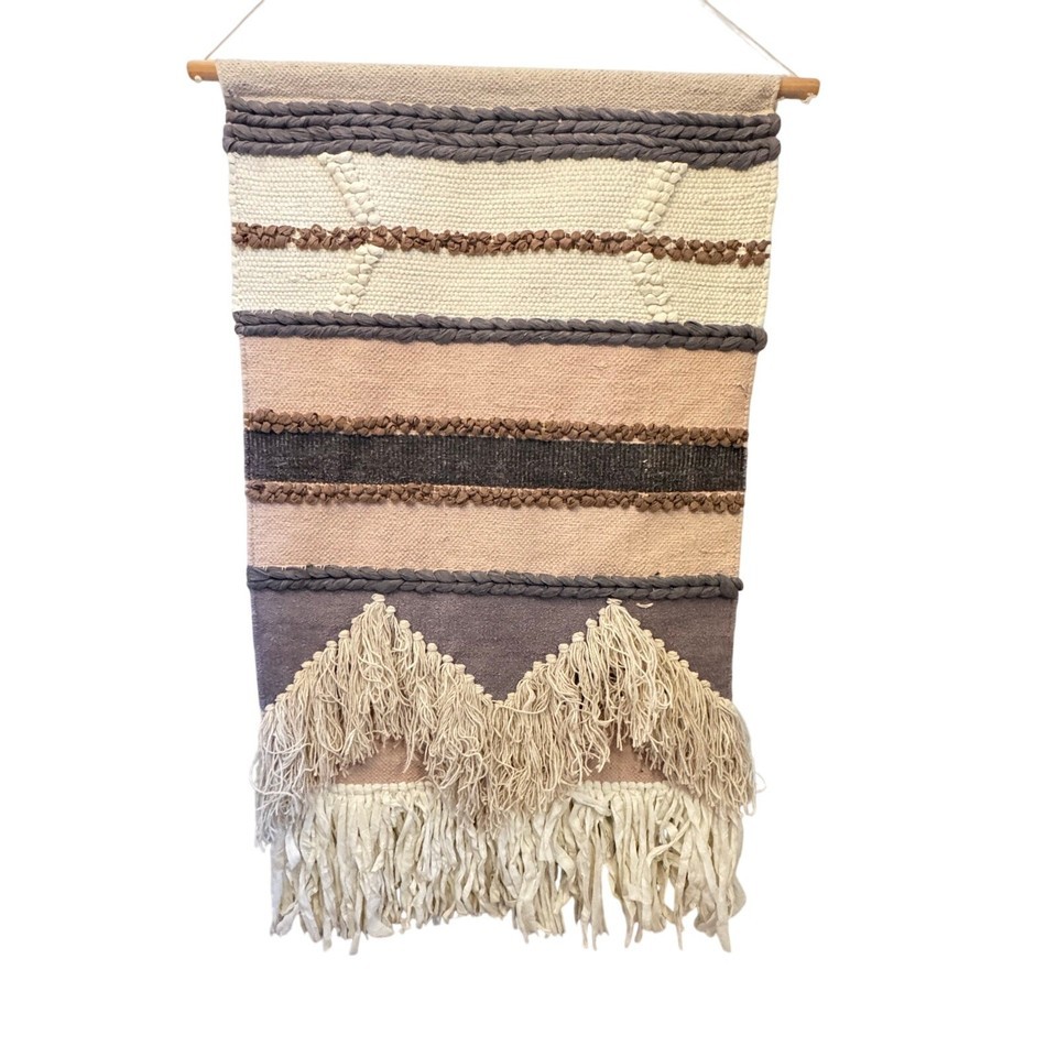 Beautiful boho-style woven wall rug/tapestry in soft earthy tones of brown and light pink. Features a sharp M-shaped pattern with cozy tufted texture, giving it a wool-like appearance. Designed with fringes at the bottom for an authentic bohemian finish. Measures 29? wide x 50? long, making it a statement wall decor piece for living rooms, bedrooms, or creative spaces.