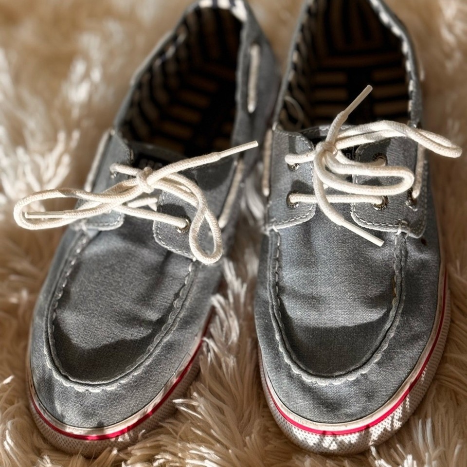 Classic Sperry Top-Sider Bahama boat shoes in gray denim fabric. These casual lace-up sneakers feature white rubber soles with a red stripe and striped fabric lining. Perfect for nautical vibes or everyday casual style. Pre-owned with signs of wear but plenty of life left. See photos for condition.