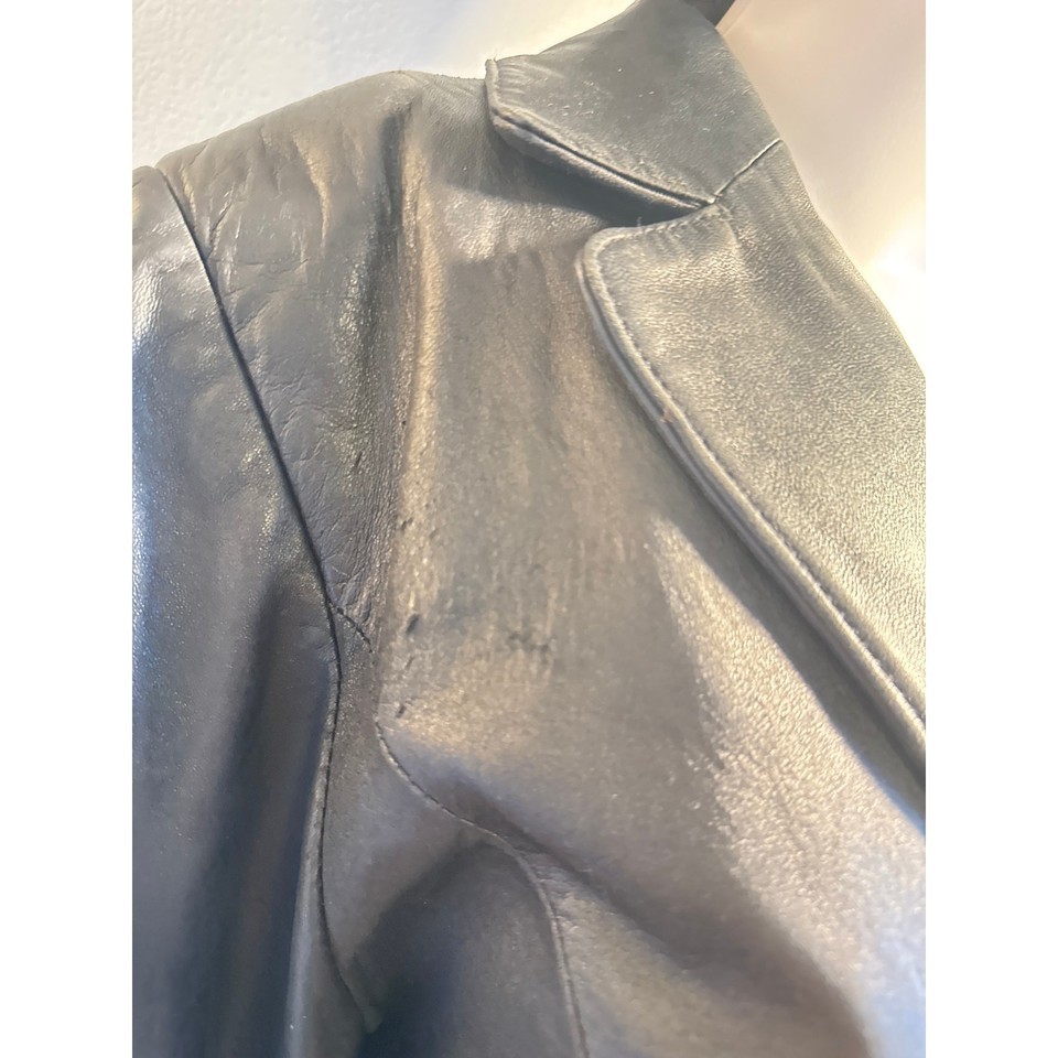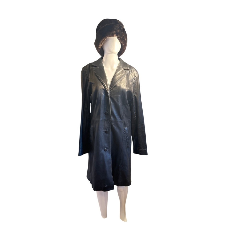 Vintage-inspired Juliet Michelle by Adler black leather coat. Crafted from genuine leather with a full button front, notched lapel collar, and two front pockets. Fully lined in a wine-red satin blend for comfort. Classic mid-length design perfect for layering in fall and winter. Shows minor wear on the leather (see photo) but overall in good condition with plenty of life left.