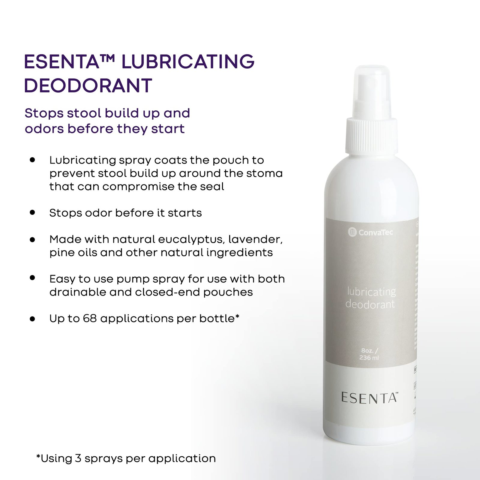 Product description: ESENTA Lubricating Deodorant is a dual-action product that can be used for odor control and lubrication. However, if a person is only concerned about stool odor, the added benefit of lubricity should not cause issues, and vice versa. Spray will coat the pouch to prevent stool build up around the stoma that can compromise the seal and lead to potential leakage. In addition to neutralizing odor, Esenta lubricating deodorant is intended to be used to improve stool passage within ostomy pouches and is recommend for colostomies and ileostomies. Please consult your medical professional if you intend to use with a urostomy. ESENTA Lubricating Deodorant is water-based, made of natural ingredients and has no added colorant. See IFU for ingredients. It is recommended to use ESENTA Lubricating Deodorant at each pouch change to achieve maximum benefit with up to 68 applications per bottle, 3-5 sprays per application. This pump spray bottle is for use with both drainable and close-end pouches. 8fl oz lubricating deodorant spray bottle.