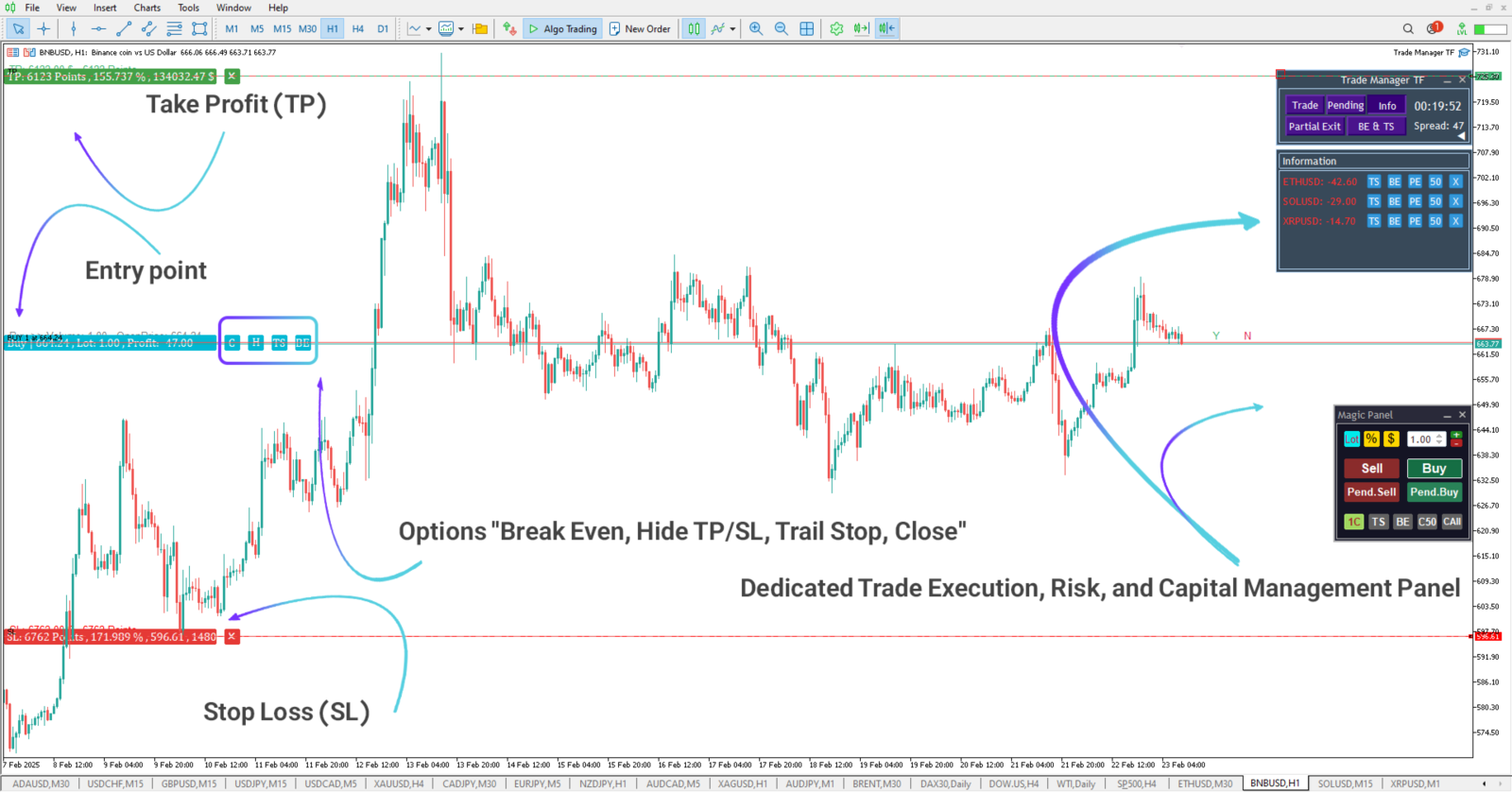 Traders can define stop-loss, multiple take-profit levels, and manage positions through the panels.