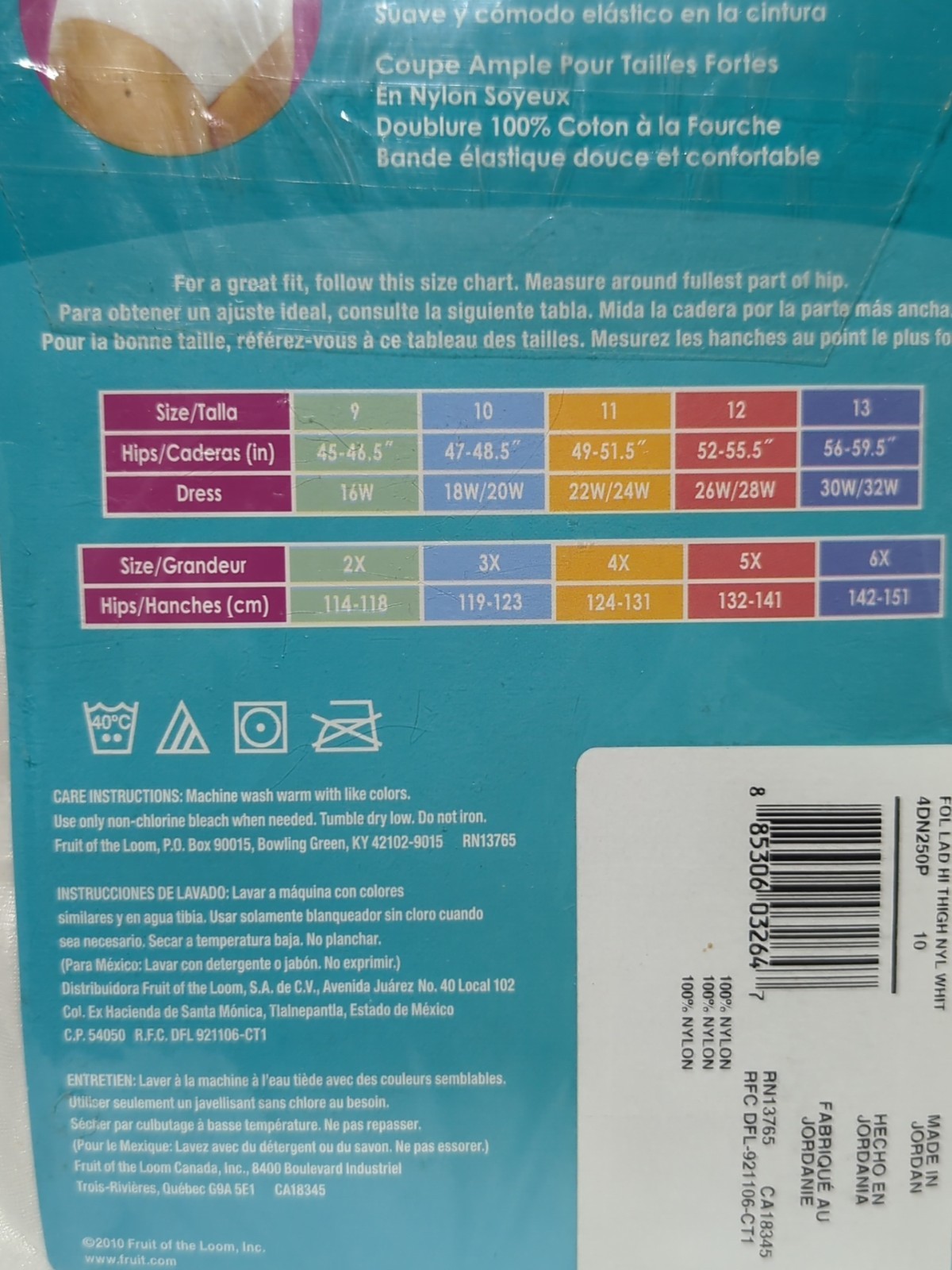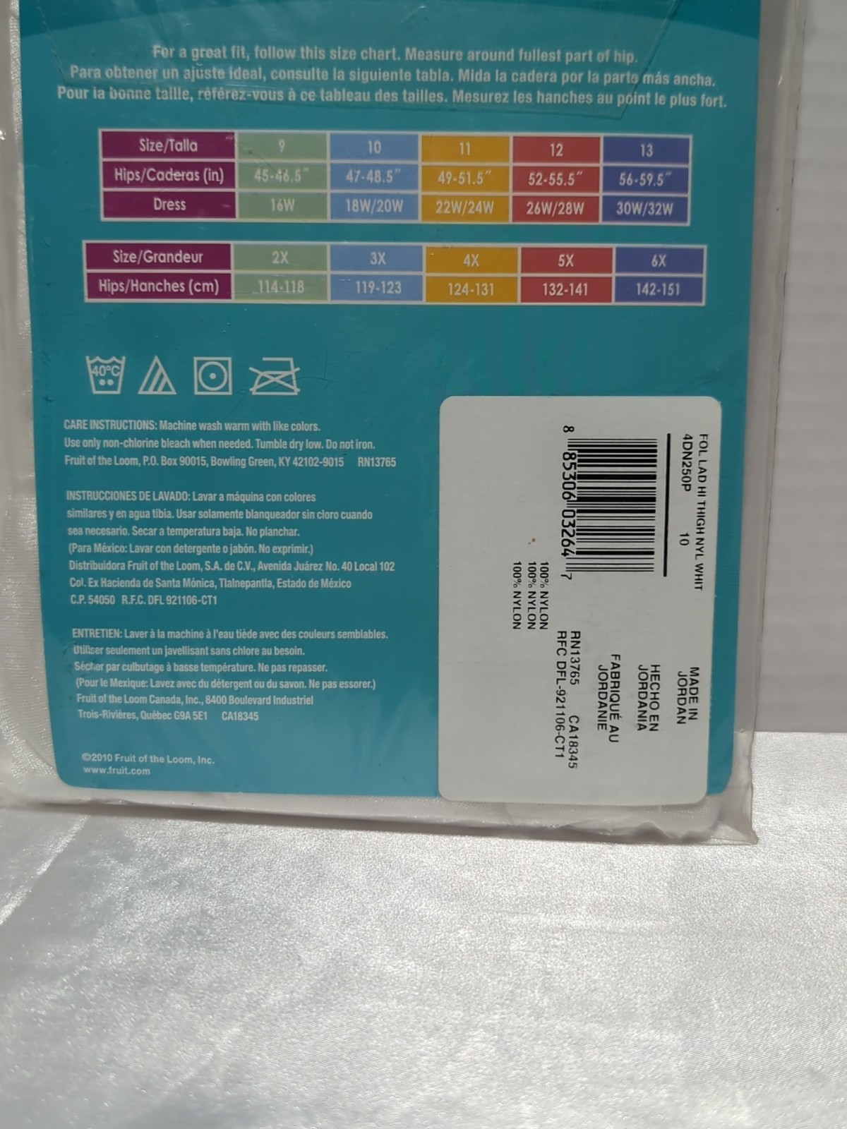 This product is a set of four pairs of vintage Fruit of the Loom hi-cut nylon panties in size 3XL, equivalent to a plus size 10. These white panties are from the 2010 and are original, 100% nylon material. They have a sexy look and are perfect for everyday wear. Made in Mexico these panties are a unique addition to any vintage lingerie collection.