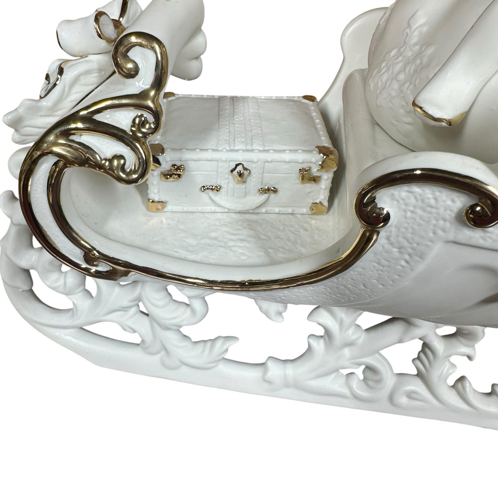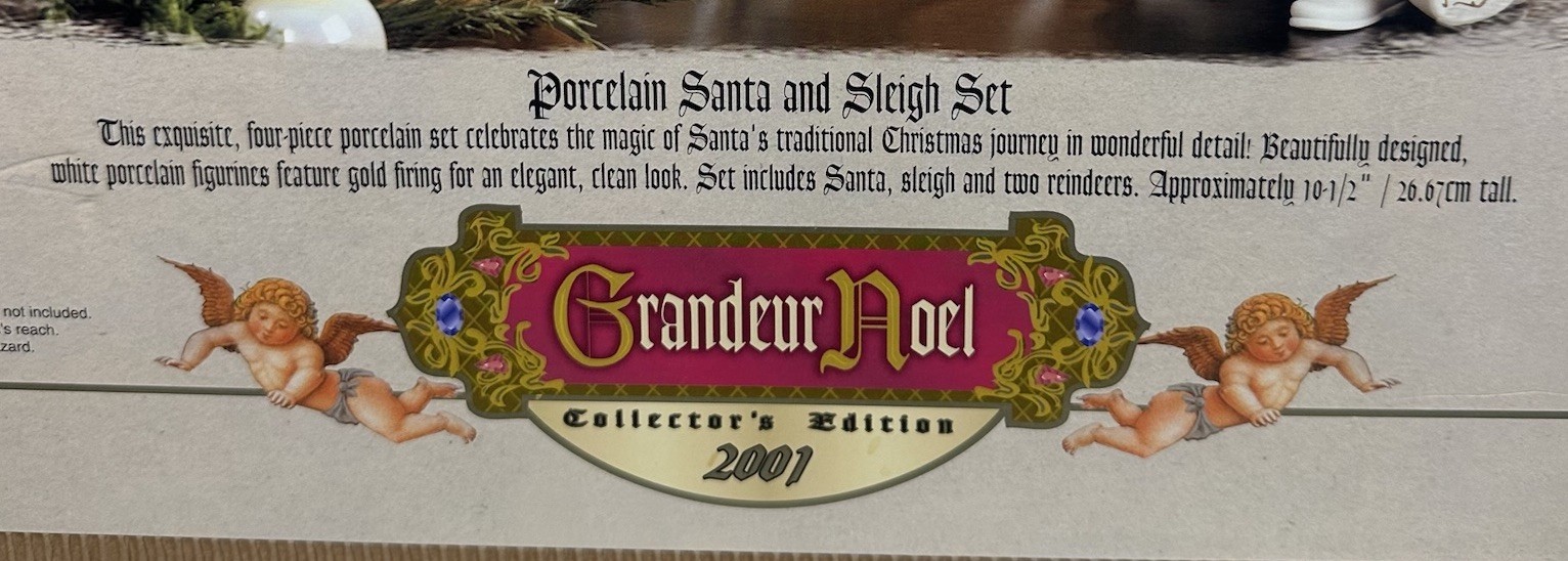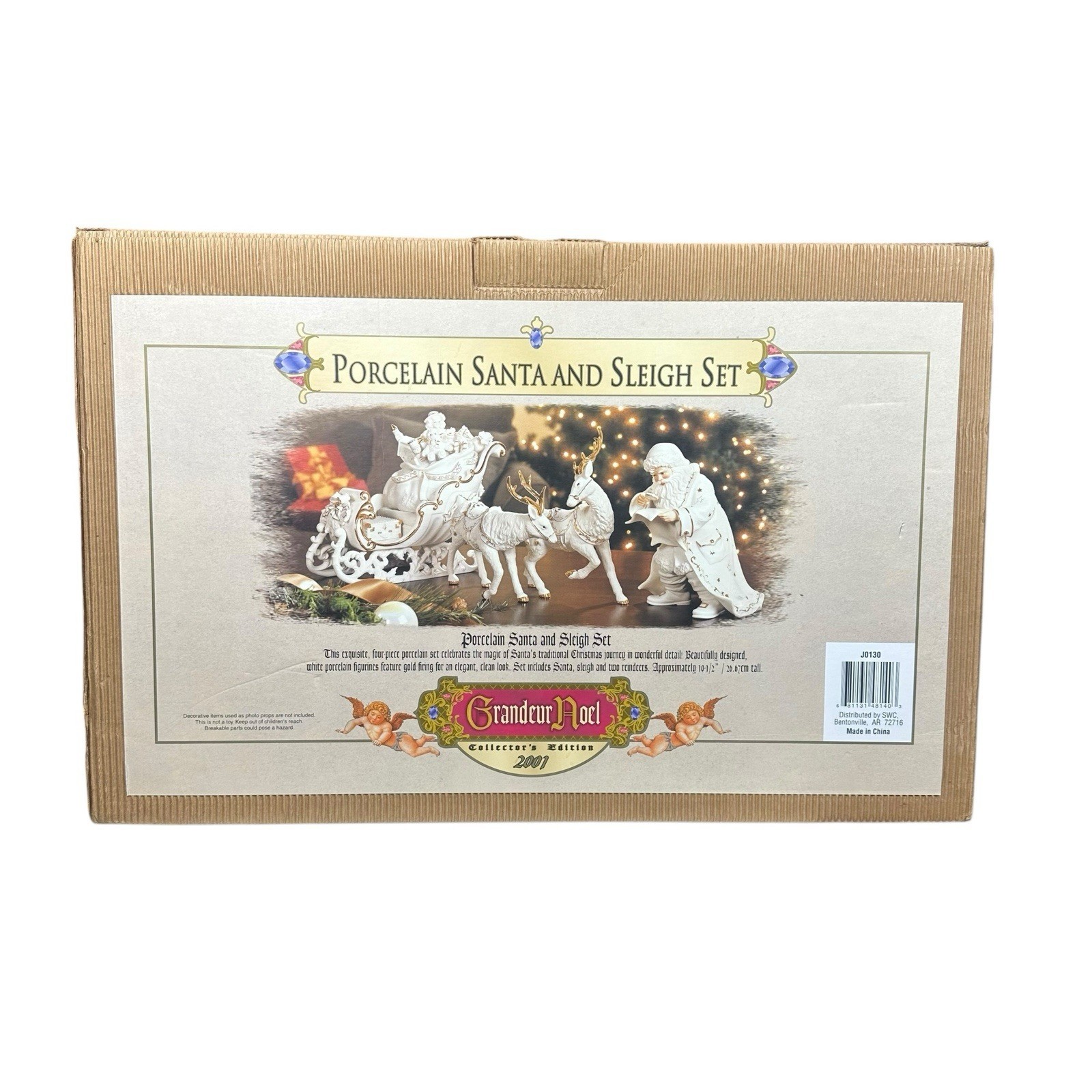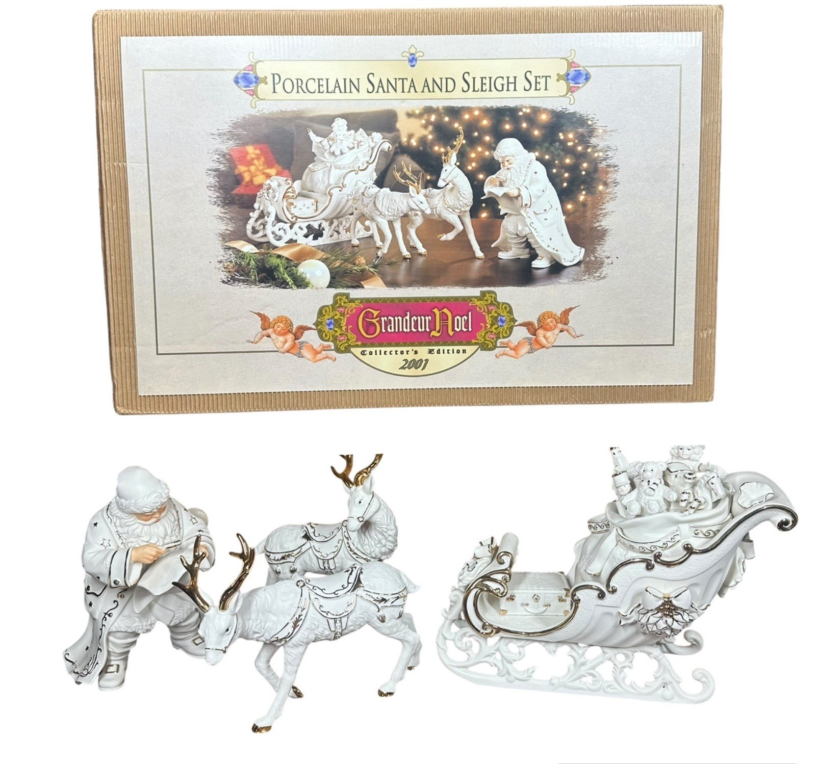 Grandeur Noel Porcelain with Gold Trim Santa and Sleigh Set w/ Reindeer 2001 Collectors Edition in Original Box