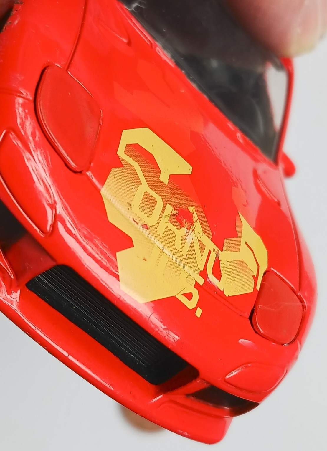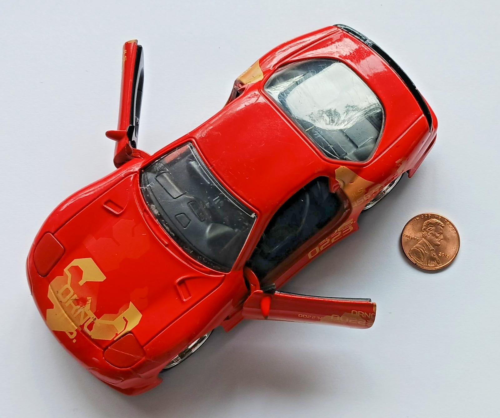This is a good condition 1:32 scale (approx. 5: inches long), JADA 3rd generation Mazda RX7 sports car. It has playwear on it, mostly scuffs around the edges, but is on good shape overall. Made of die cast metal with plastic parts, very nicely detailed and with opening doors and smooth rolling wheels!