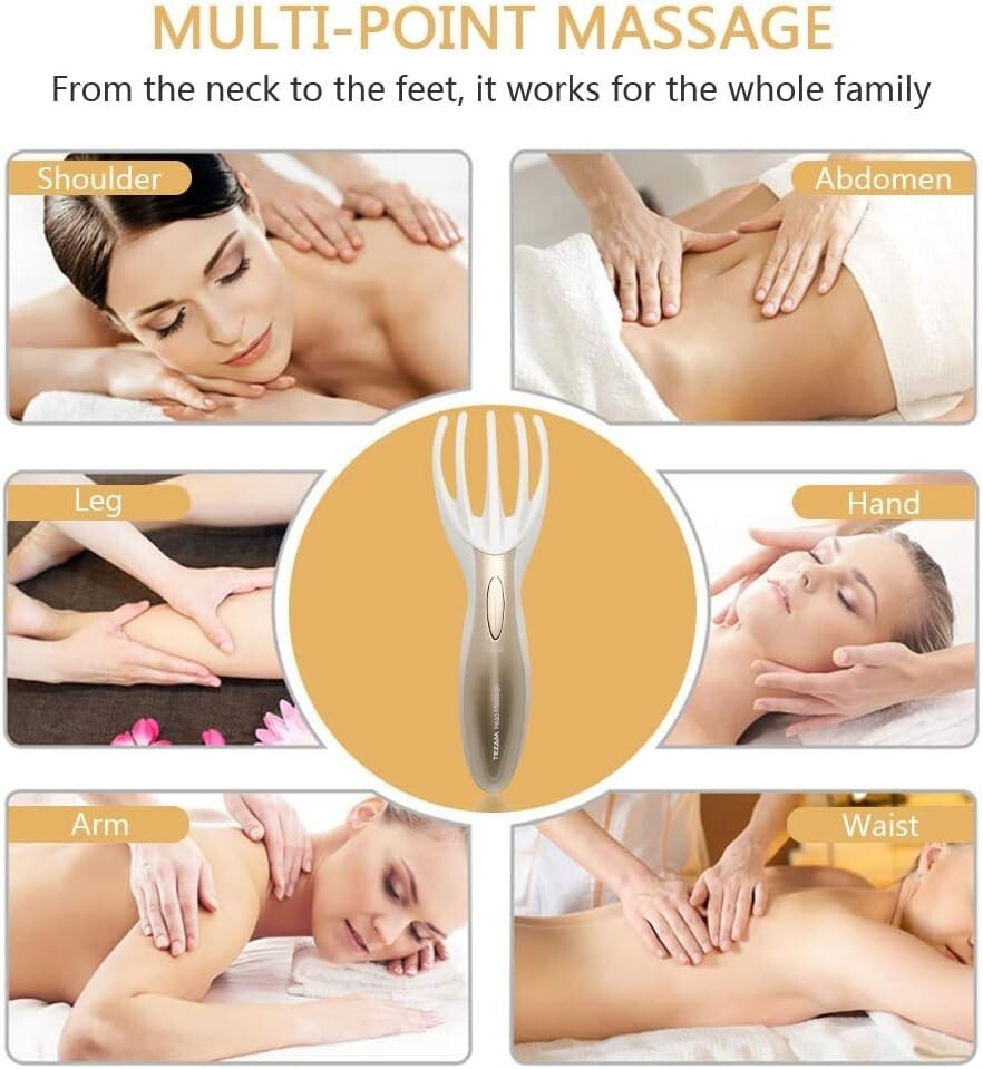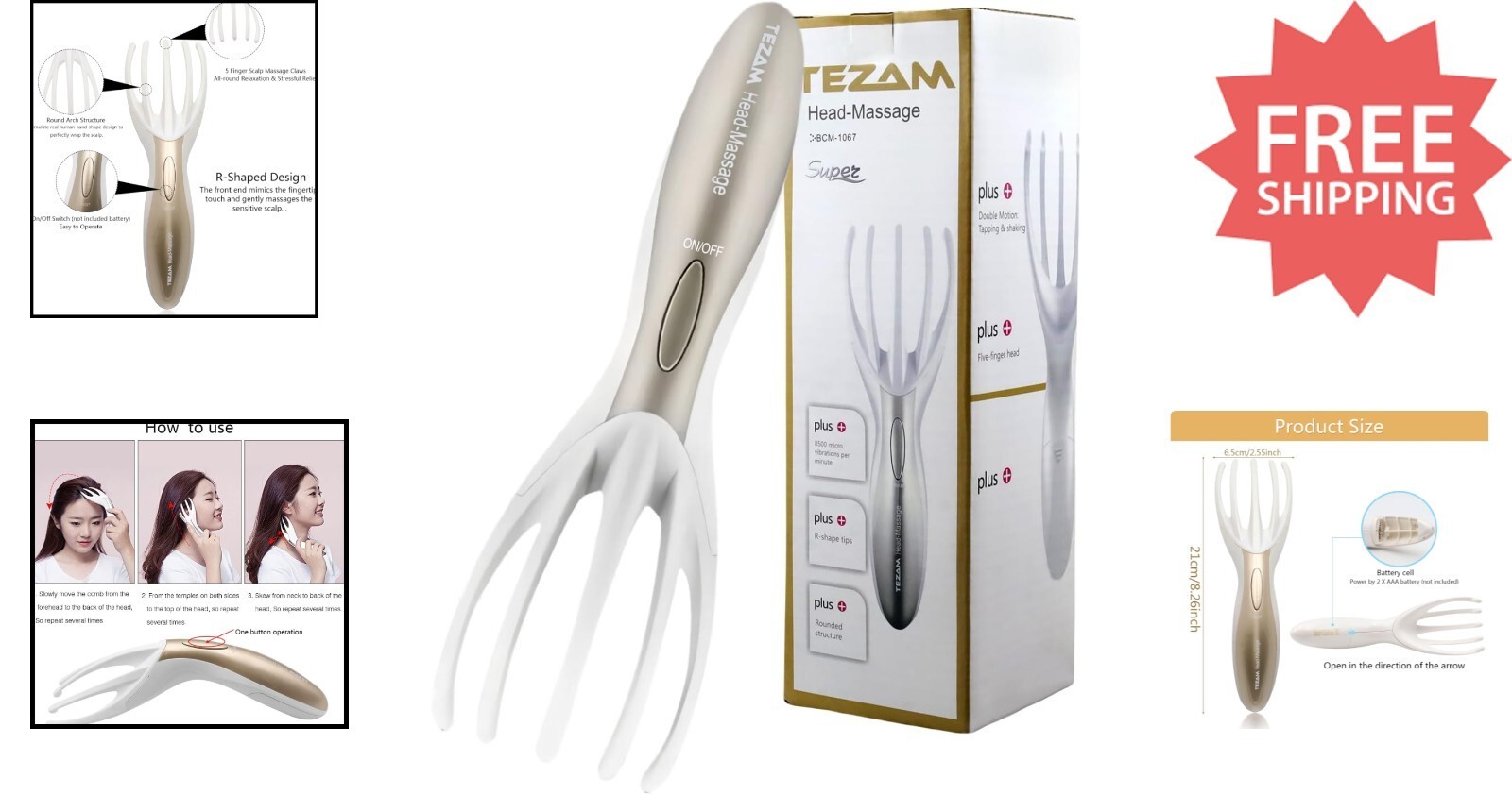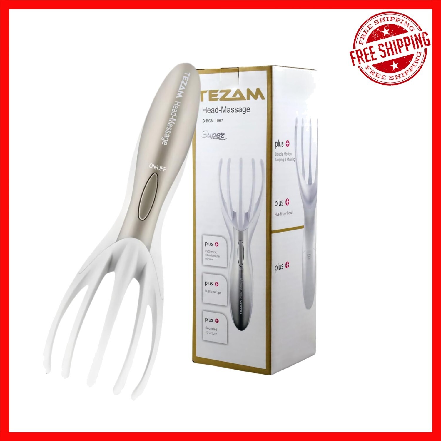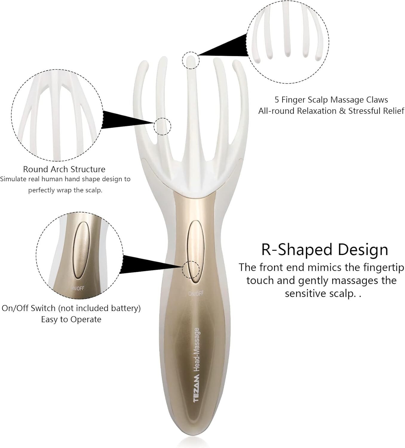 Experience ultimate relaxation with the Tezam Head Massager, an ergonomic device featuring five vibrating fingers that simulate a soothing head SPA at any time. Glide over your scalp to promote a euphoric feeling, reduce stress and anxiety, and boost scalp blood flow for healthier hair growth. Designed to alleviate tension, improve sleep quality, and combat fatigue, this versatile massager works not only on your head but also on your neck, arms, legs, and back. Powered by 2 AAA batteries (not included), it?s lightweight, easy to use, and perfect for home, travel, or office. Just 10 minutes a day can enhance your well-being. Packaged in a well-designed box, it makes an ideal gift for men, women, parents, and friends.