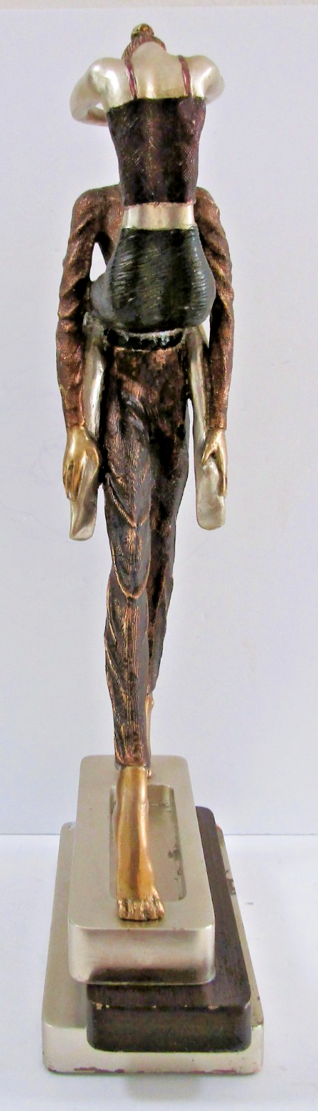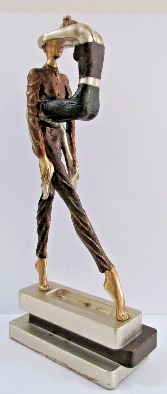 The Vintage Artmax Dancing Couple Sculpture on Tiered Base is a large and stylish piece of contemporary art. Standing at 26.5 inches tall, this fluid and stylized sculpture features a dancing couple in an art deco style. Made of wood, resin, and paint, this original sculpture captures the theme of dance and figures with its intricate details and artistic flair. Perfect for adding a touch of elegance and whimsy to any home or art collection, this Artmax piece is a unique and eye-catching addition. Based on the fluid and stylized form of the sculpture, the pose appears to depict a dynamic and expressive dance movement, possibly inspired by modern or contemporary dance, or even an acrobatic or gymnastic pose. While there isn't a universally recognized name for this exact specific pose, the piece evokes the graceful and physically demanding nature of dance.