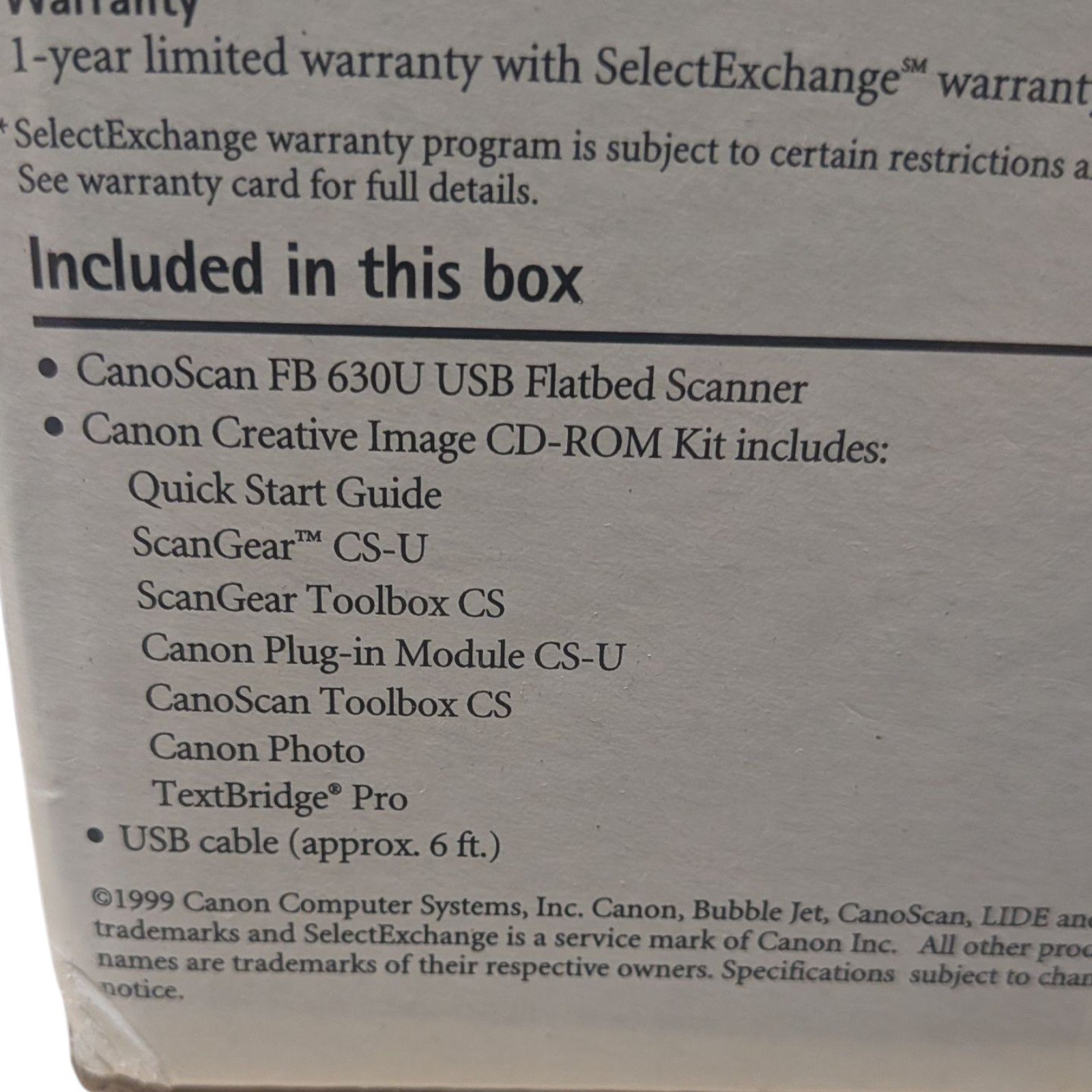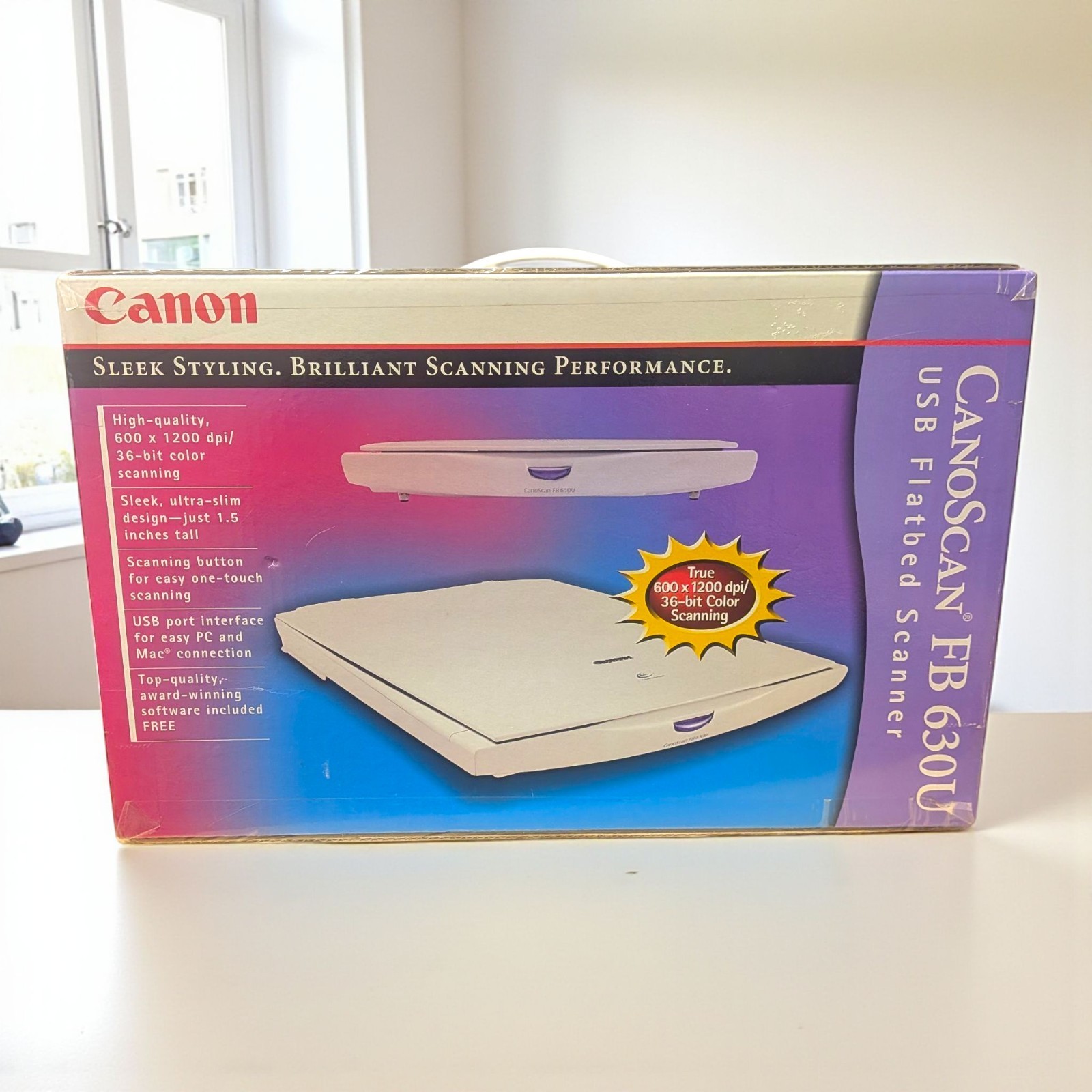 This is a new old stock (NOS) Canon CanoScan FB 630U USB Flatbed Scanner from 1999. The box is sealed and contains all original accessories and software as listed on the packaging. A great piece for collectors, retro computing enthusiasts, or anyone looking for a vintage flatbed scanner that still delivers high-quality results.