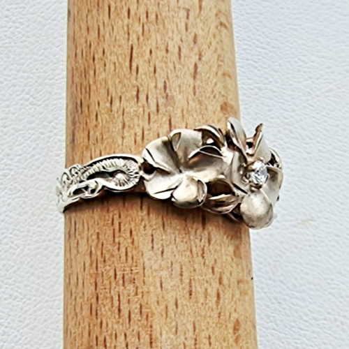 This vintage 925 sterling silver ring features a beautiful floral design with a natural white topaz as the main stone. Signed and crafted with sterling silver and 3mm band width, this size 8.75 ring exudes elegance and beauty with its prong setting style. Perfect for those who appreciate vintage jewelry and fine gemstones, this ring is a timeless piece that captures the essence of beauty and sophistication.
