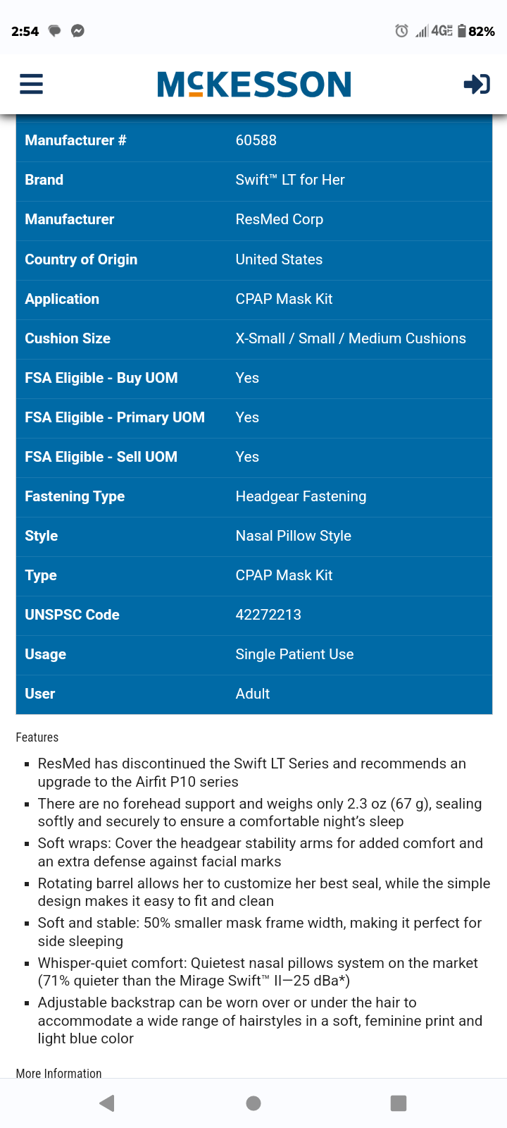 ResMed three size Swift LT for her CPAP pillow system brand new discontinued by manufactur, hard to come by and sleep is too so better get it before it's gone.