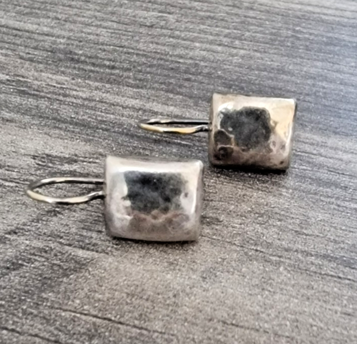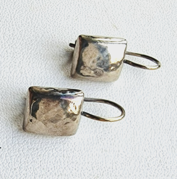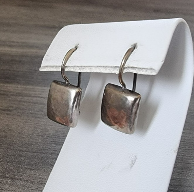 The product is a pair of vintage Silpada 925 sterling silver hammered square earrings from around 1970. These dangle/drop earrings feature a square shape with a hook closure, making them easy to wear. The elegant design and use of high-quality sterling silver make them a beautiful and timeless addition to any jewelry collection. With their vintage charm and unique silpada branding, these earrings are sure to be a stylish and eye-catching accessory for any outfit.