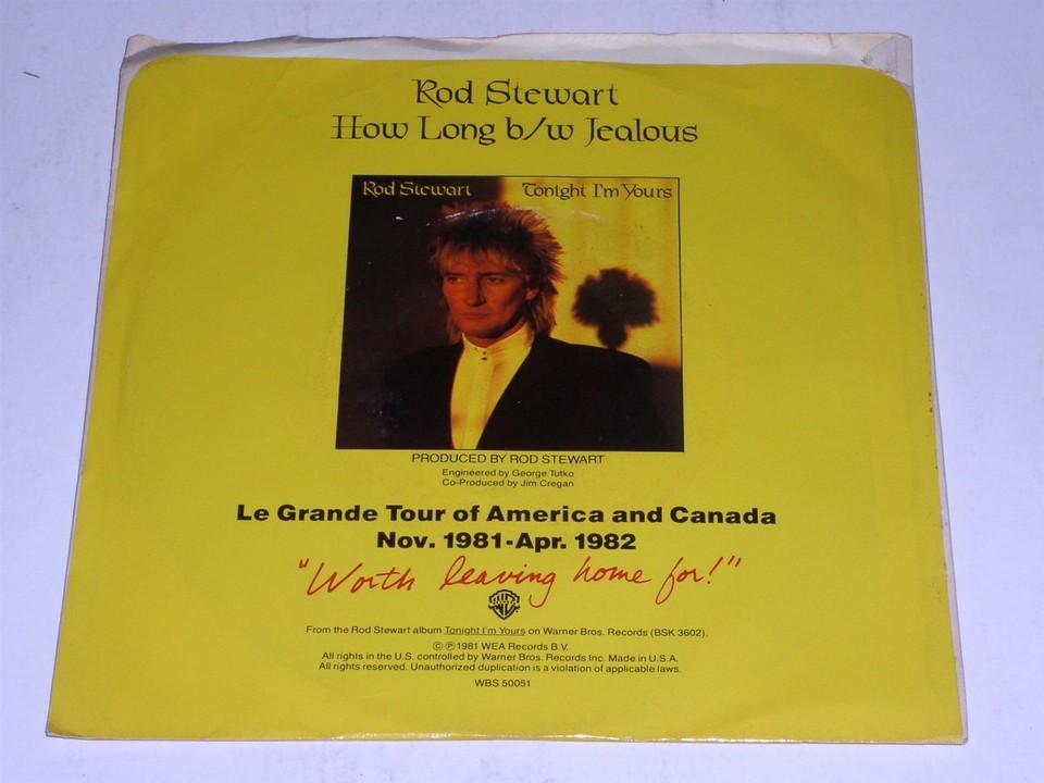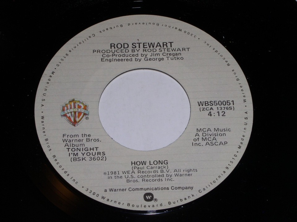 This is a vintage 45 rpm phonograph record by Rod Stewart entitled, "How Long". Flipside: "Jealous". Record label W.B. WBS 50051. Comes with its original picture sleeve as shown.