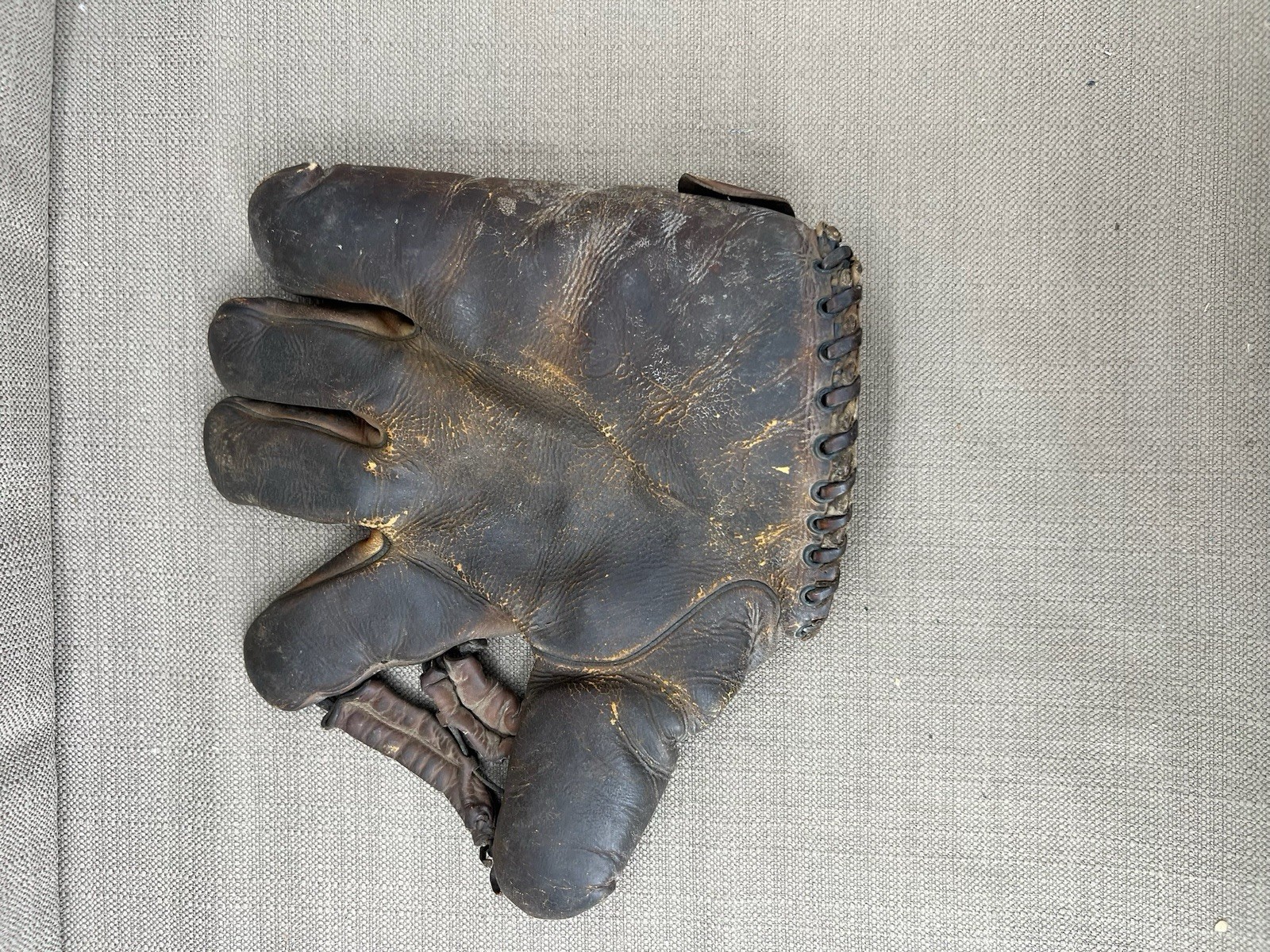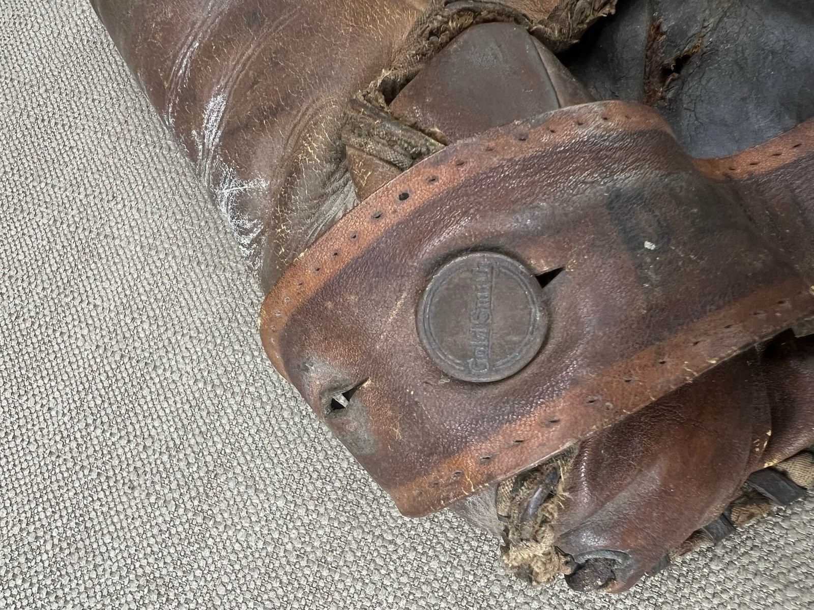 Step back into baseball history with this vintage 1940s GoldSmith Claude Passeau glove, crafted from durable horsehide leather. This early mitt style is endorsed with Chicago Cubs pitcher Claude Passeau, making it a great collectible for sports memorabilia, vintage baseball gear, and antique leather gloves enthusiasts. The glove shows authentic age-related wear and patina, adding to its charm and character. Stamped with the GoldSmith logo and Passeau?s name.