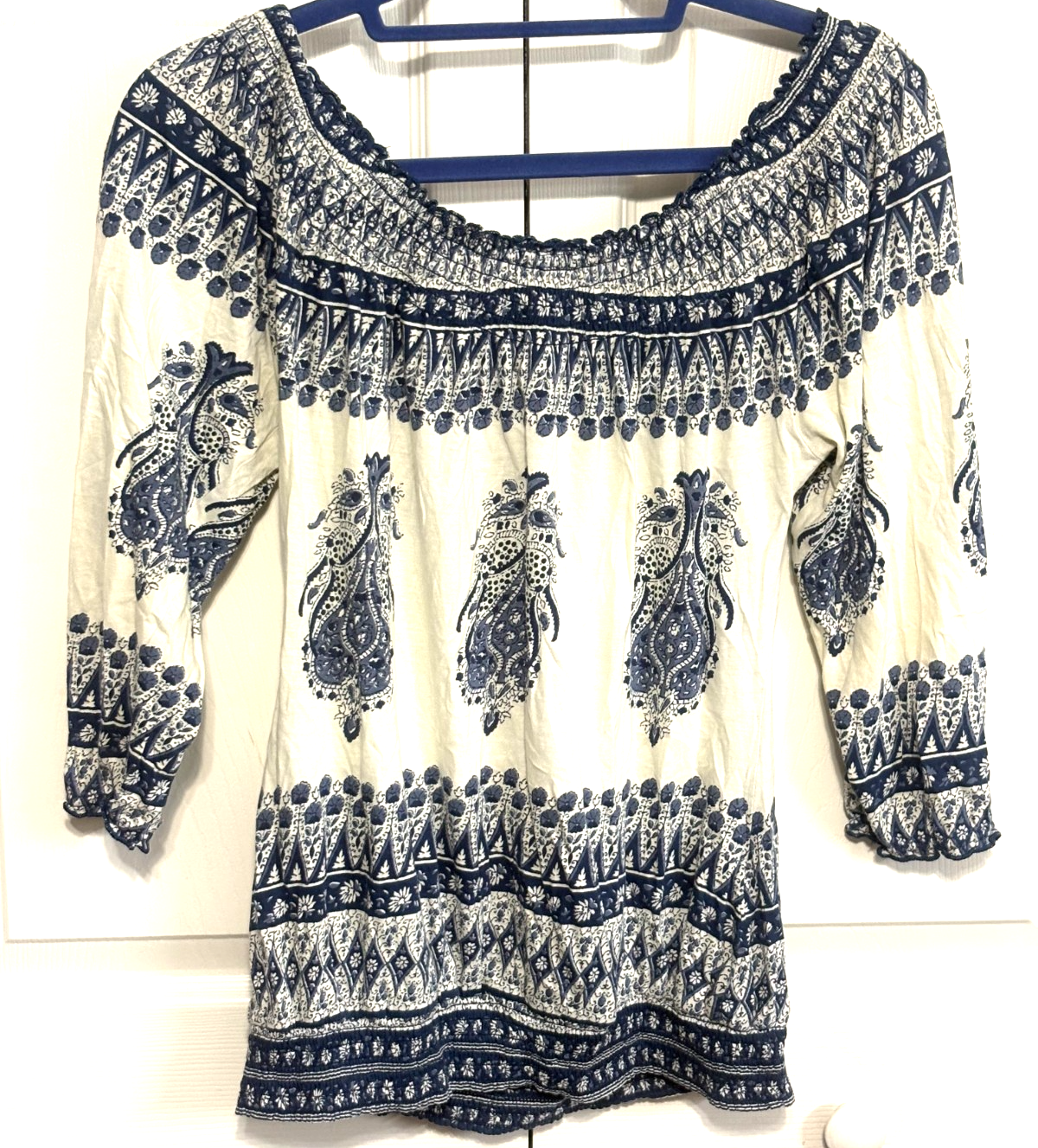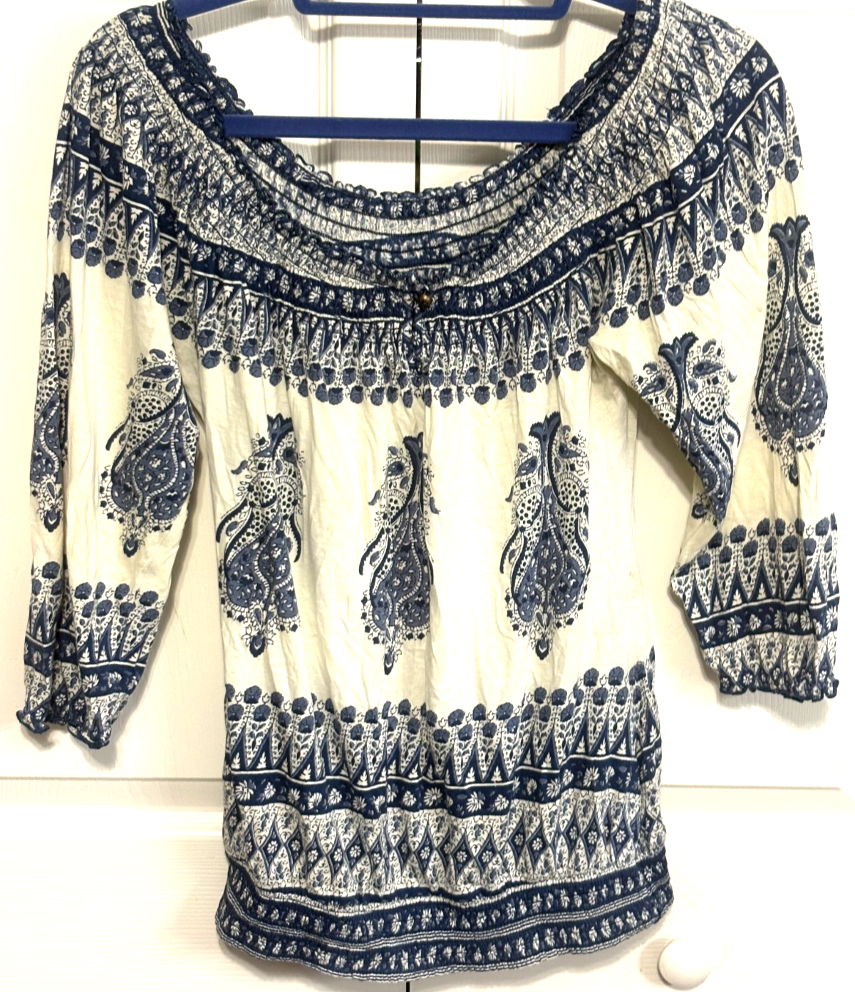 Lucky Brand Womens Blue & Cream Small Boho Chic Top Blouse Shirt