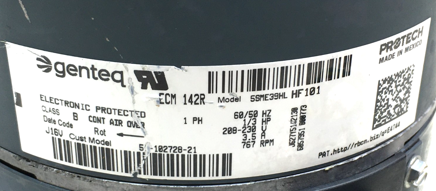 This is Genteq GN01 5SME39HLHF101 Blower Motor 51-102728-21 230V 1/3HP 767 RPM CCW Lead End rotation, used part.