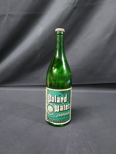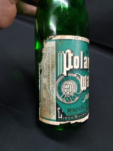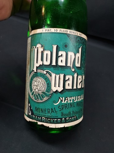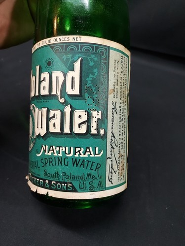 OLD Poland Spring Water Bottle Maine Hiram Ricker Sons Original Label Cap. Condition is Used. Shipped with USPS Ground Advantage.