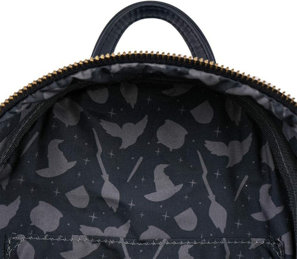 The Harry Potter Diagon Alley Sequin Mini Backpack is made of vegan leather (polyurethane). Bag has adjustable shoulder straps, sturdy metal hardware, and features: foil, and printed details. Take note of the coordinating pattern of the inside lining fabric.