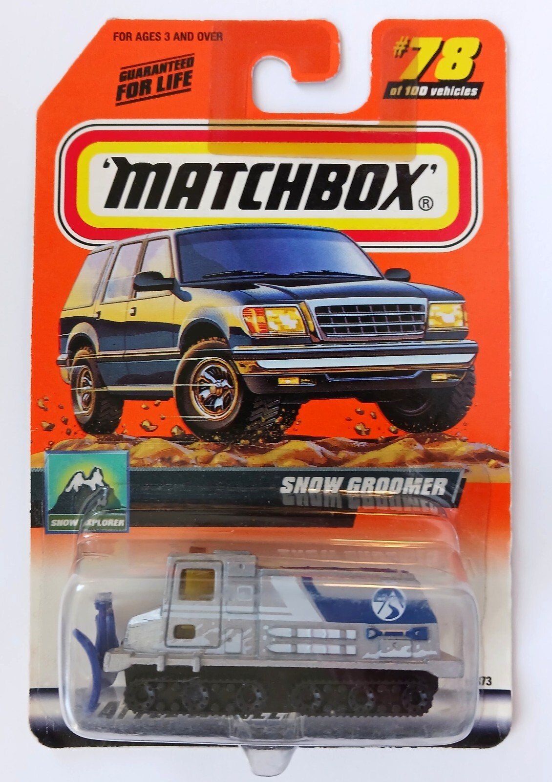 This is a Matchbox Snow Groomer Sno-Cat tracked vehicle. It's in still new it's package condition, from 1999. With an opening compartment in the rear and small rolling wheels underneath, die cast metal with plastic trim. There's some storage wear on the package, but the snow plow inside is untouched. Cool version of a SnowCat!