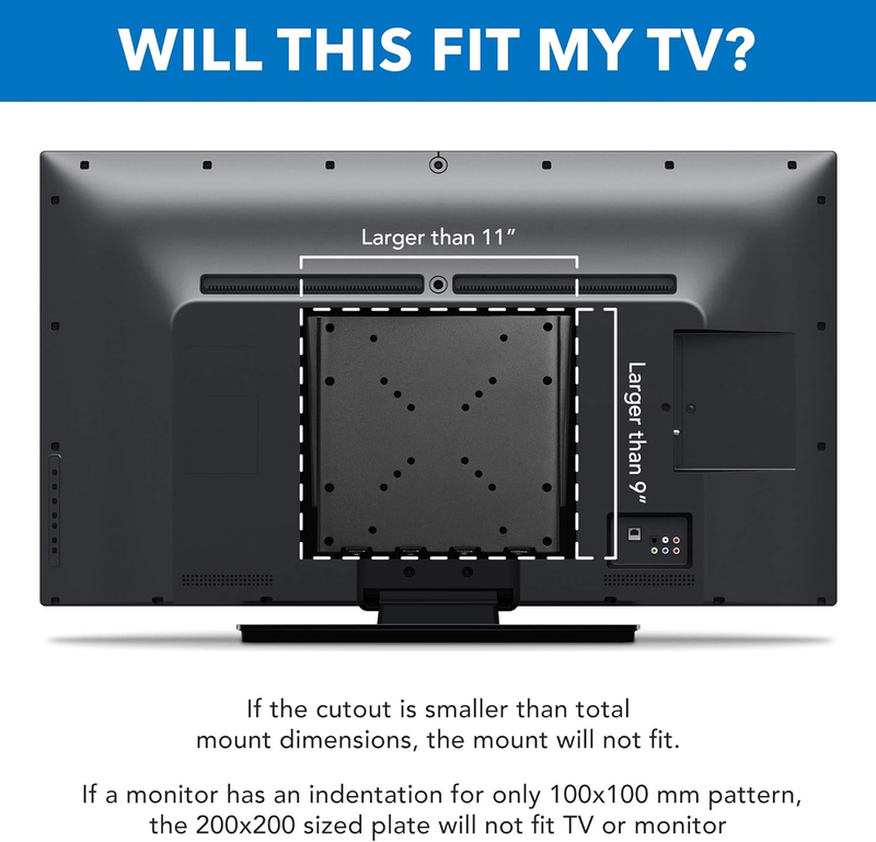 Verify the distance between the four holes on the back of your TV is less than 8" or 200mm.