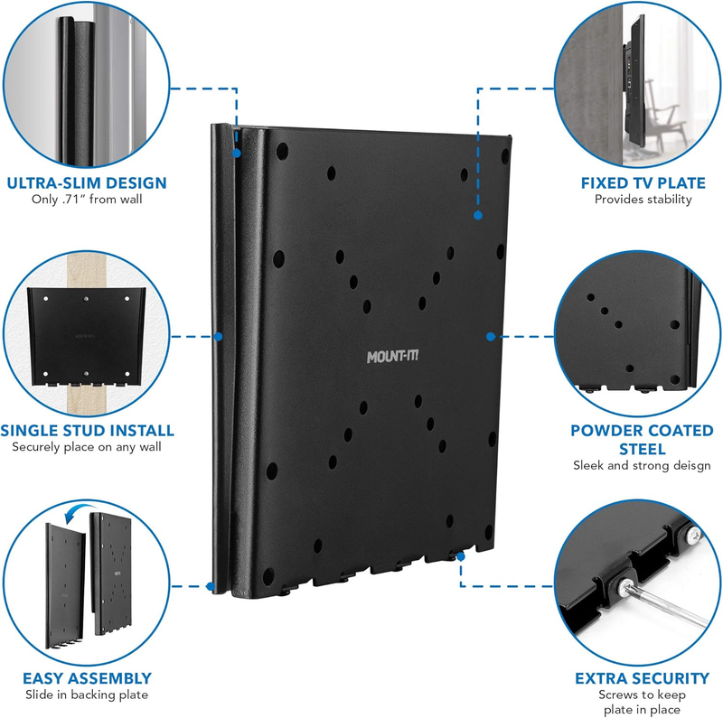 The MOUNT-IT! Fixed TV Wall Mount is your all-in-one low profile TV mounting solution that offers durable support with a discrete ultra-minimal design. Our wall mount keeps your LED, LCD TV or monitor display flush against the surface, being held at just 0.7? off of your wall. Its impossibly slim profile strikes the perfect balance between strength and style. Despite its minimal footprint, our mount is precision-engineered using a powder-coated solid steel frame for support you can trust.