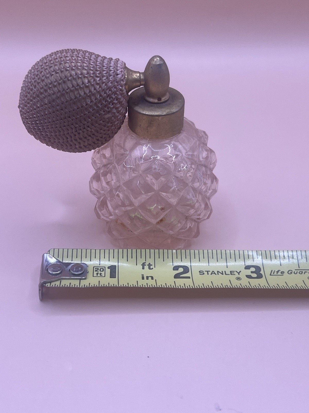 This listing is for a beautiful vintage perfume atomizer bottle featuring a diamond-cut clear glass body and a pink mesh-wrapped bulb. Bulb is dirty. The metal collar and nozzle show signs of age-related patina, adding to its antique charm. Likely dates from the 1940s to 1950s.