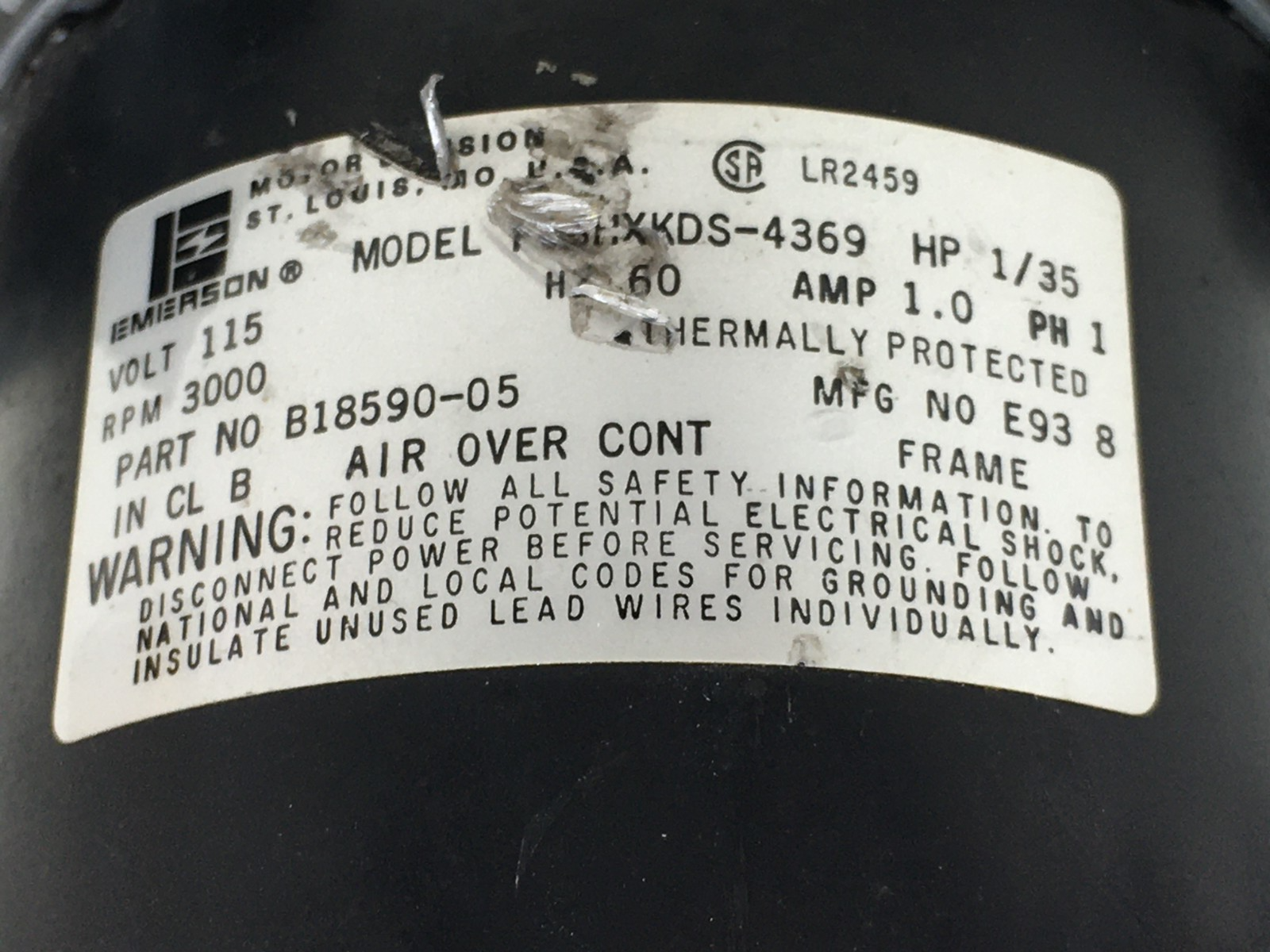 This is EMERSON F33HXKDS-4369 Furnace Draft Inducer Blower Motor B18590-05 115 V 3000 RPM 1/35HP used part.