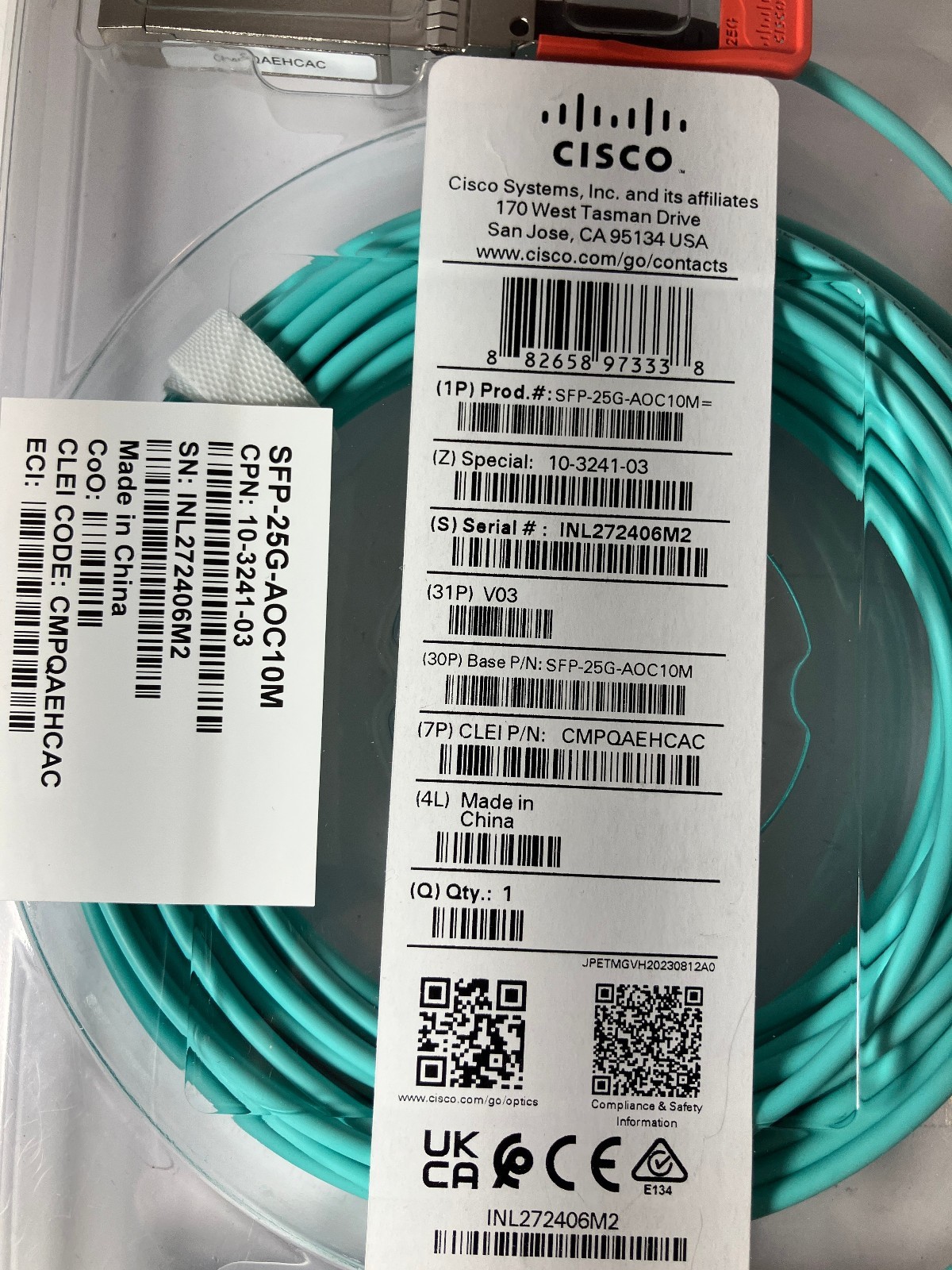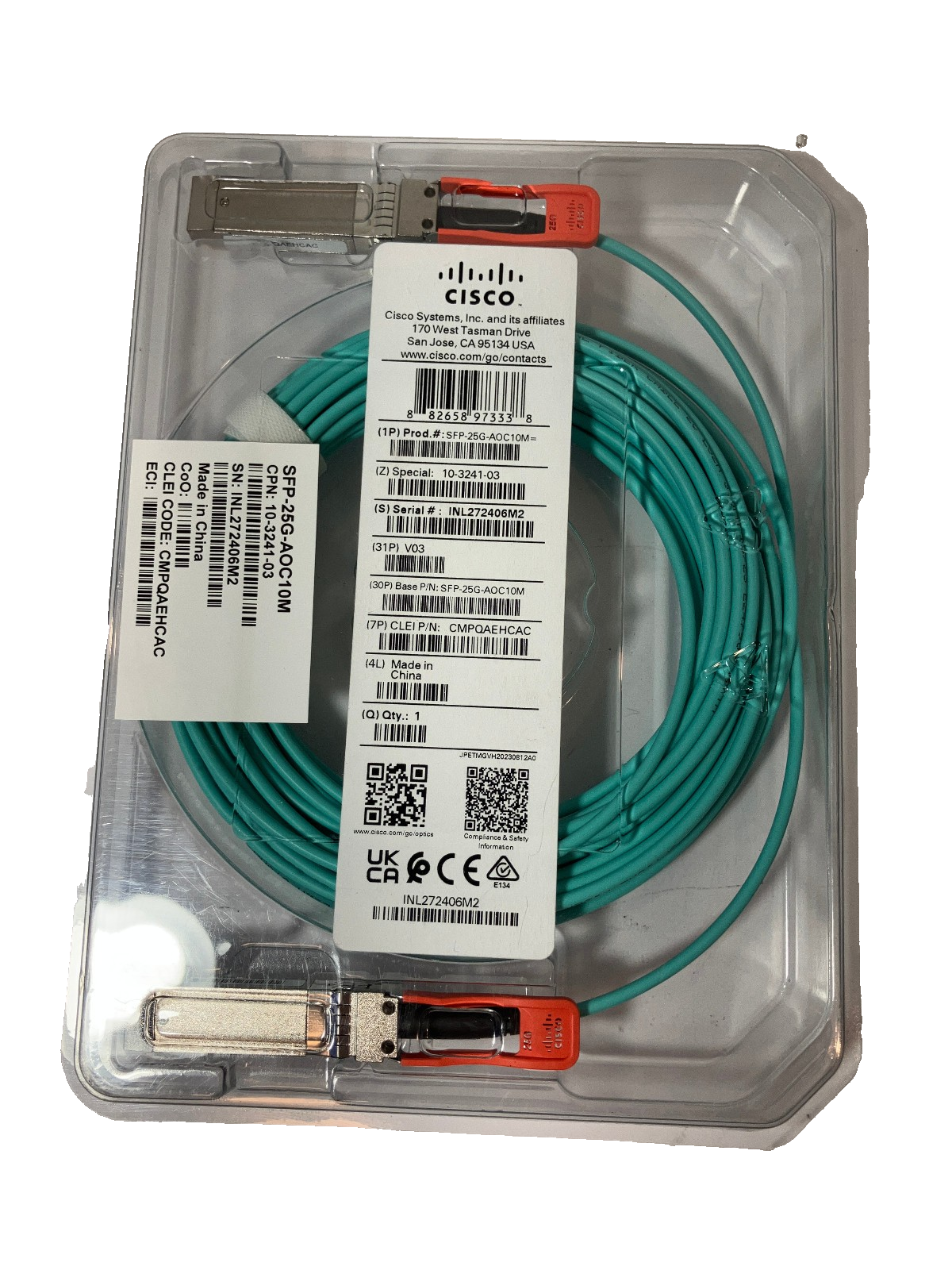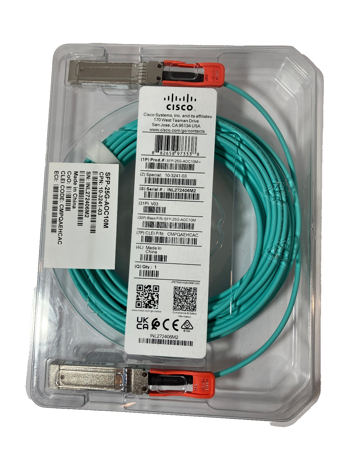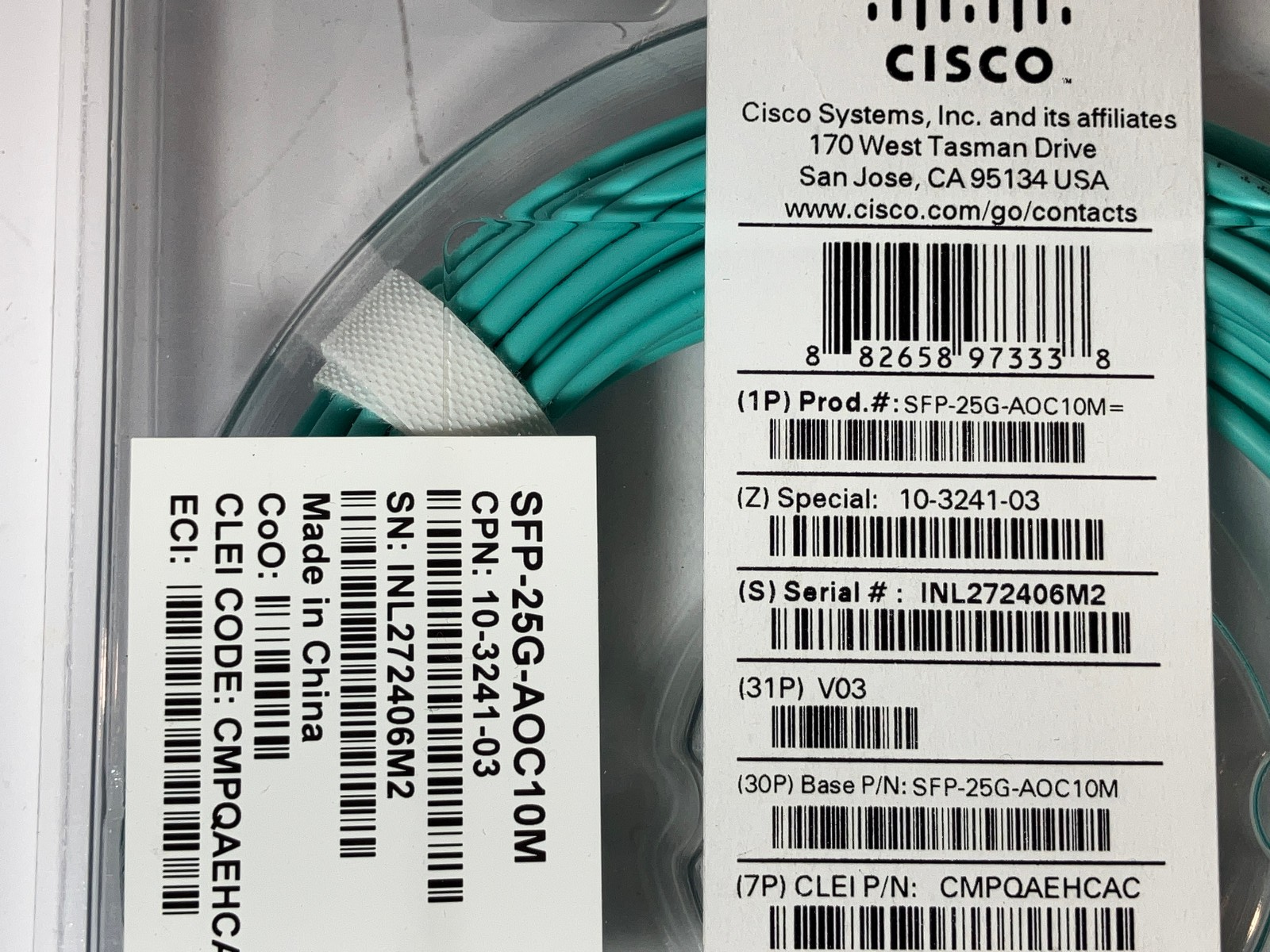 This listing is for a New genuine Cisco cable SFP-25G-AOC10M (10-3241-01) 25G Base Active Optical Cable with hologram.