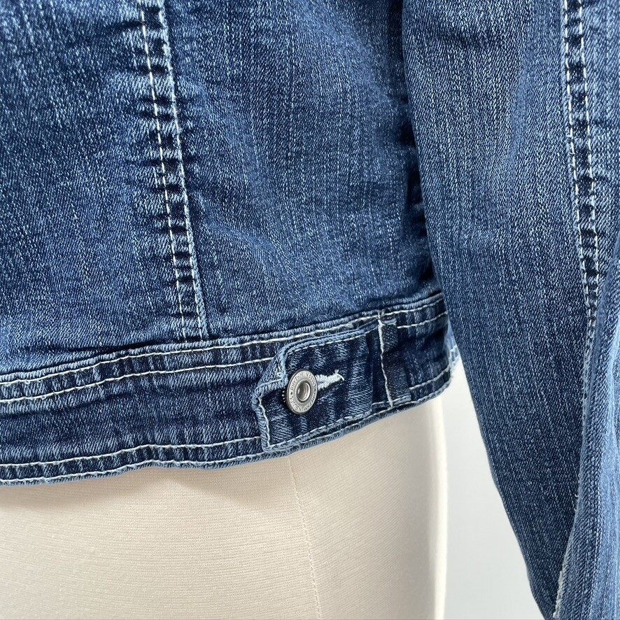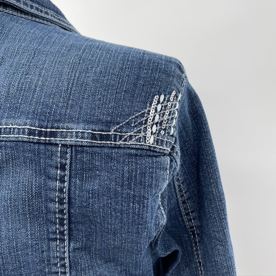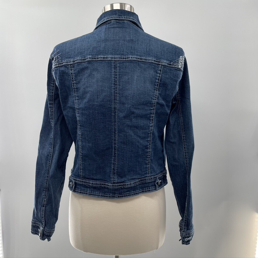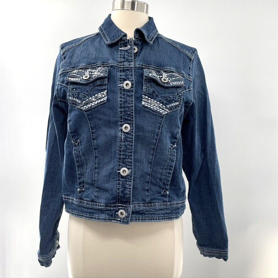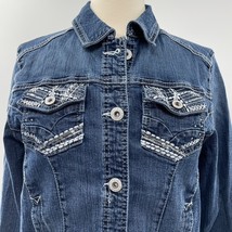 Rhythm in Blues Womens Blue Denim Embroidered Jean Jacket Coat Size Large L