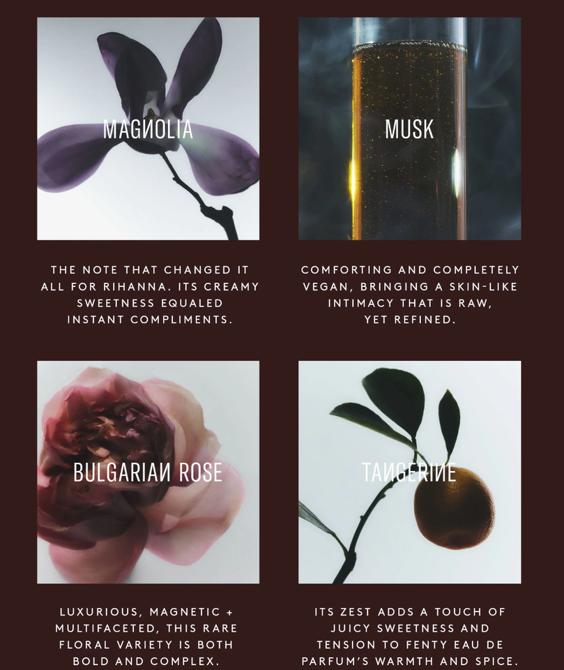 Comforting vegan Musk collides with luxurious Bulgarian Rose Absolute while Patchouli and juicy Tangerine create a tension between spicy and sweet. And then there?s the star, the note that changed it all for Rihanna: Magnolia. Its creamy sweetness with a zesty twist equaled instant compliments for its creator and wearer.