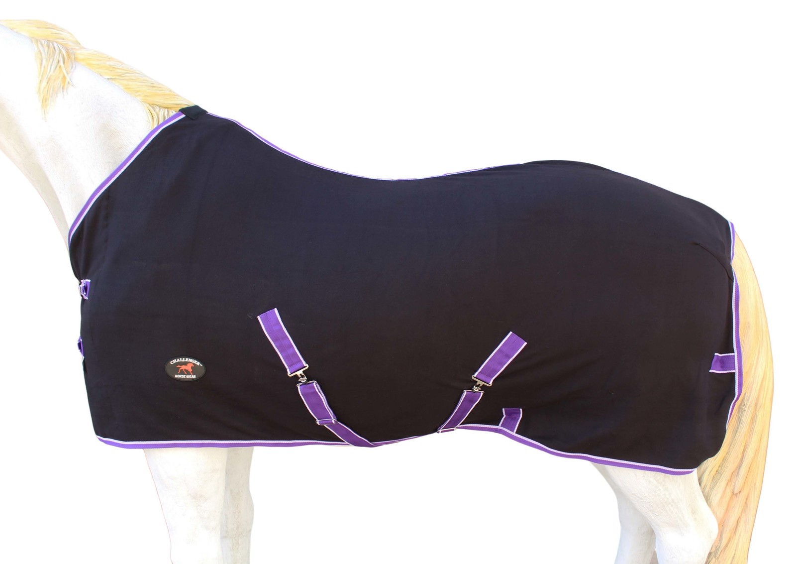 Challenger soft fleece cooler is a multipurpose lightweight blanket. Fleece coolers are used to help your horse cool down after a workout or physical exercise, but can also be used to add a layer of warmth on a chilly night. The soft fleece is made of breathable fabric which allows sweat and moisture on the horse's coat to escape. Features a soft fleece trim at the neck of this blanket for added comfort for your horse. The adjustable double buckles, cross surcingles, and leg straps help keep blanket secure and in place.