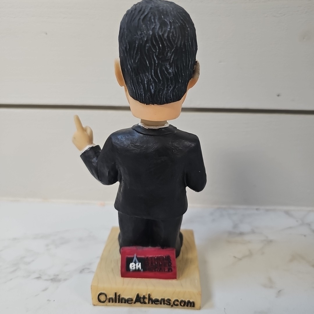 The Coach Jim Garrick Bobble Head featuring the Georgia Bulldogs is a vintage sports memorabilia collectible that celebrates the legacy of the legendary coach and the Bulldogs. This unique item showcases Garrick's distinguished look and is a must-have for any fan of the Georgia Bulldogs or collector of vintage sports memorabilia. Perfect for displaying in a fan cave or office, this bobble head captures the spirit and tradition of the beloved team.