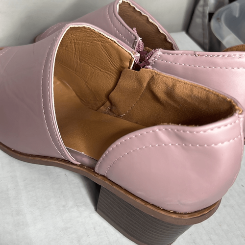 These slides have small lines block heels. They have a rounded toe area. They also have a peep toelook. An angled cutout has been added to the sides of the shoes. A small zip closure has been added to the ankle.