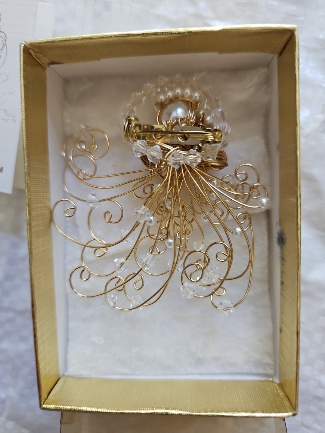 Baby is beaded with tiny pearl beads. Both are encircled in a crystal halo.