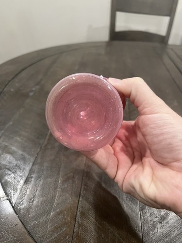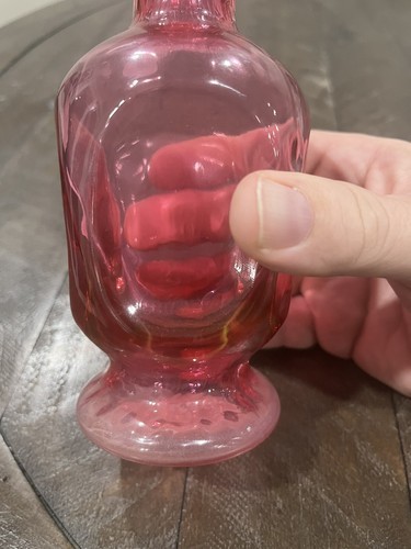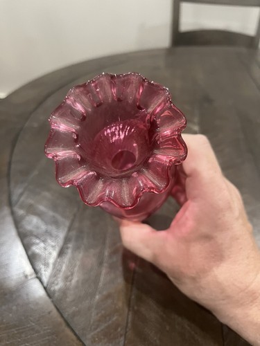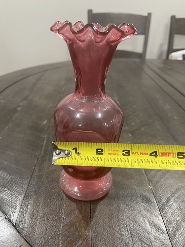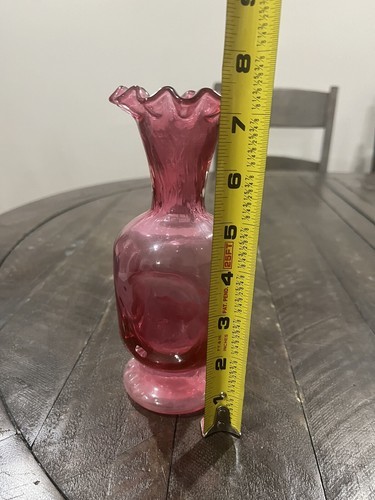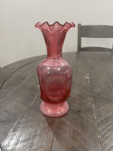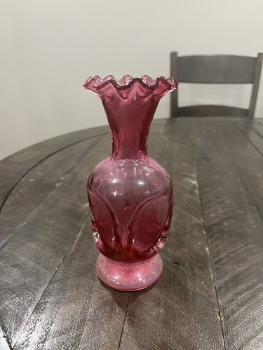 This Fenton glass vase is a stunning piece of art deco style. The vase is hand blown with a glossy finish, featuring a beautiful cranberry red color. The vase is 7.25 inches tall and has a pedestal base.