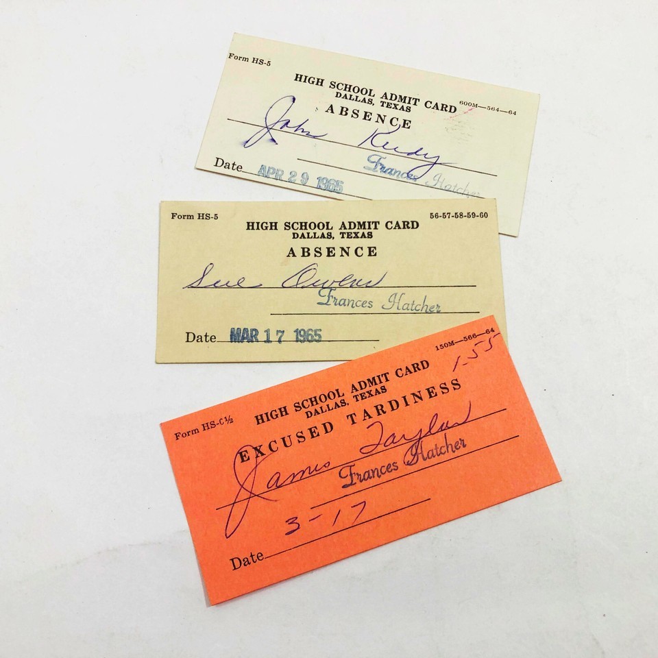 This is a collection of 3 Dallas High School student cards for getting out of class and excused absence from class.