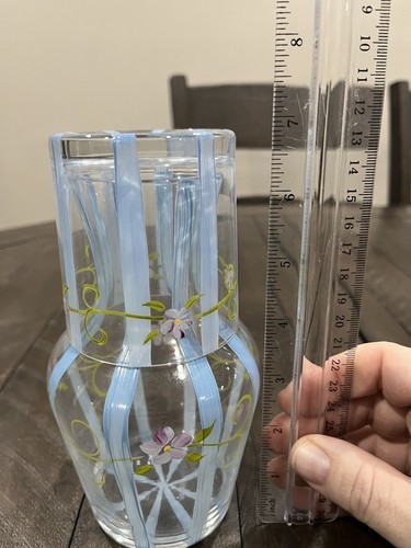 Add a touch of elegance to your bedside with this beautiful vintage hand-painted water vessel. The jug features stunning purple flowers and blue stripes, giving it a Victorian style that will fit perfectly into your decor. This set includes two items, and both are made of high-quality glass, ensuring that they will last for years to come. The jug is unmarked, making it a unique and one-of-a-kind addition to your collection. Use it to store water or other beverages, or simply display it as a decorative piece. With its charming flower theme and intricate detailing, this jug is sure to make a statement in your home.