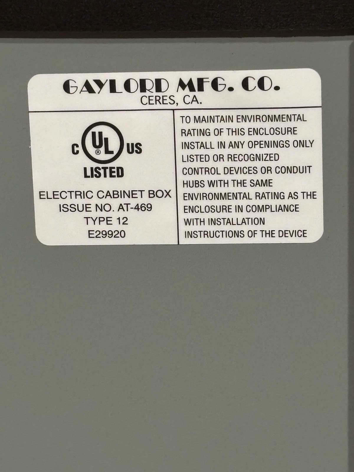 Gaylord Type 12 (E29920) Outdoor Enclosure 12x12x4 New - Same Day Ship The Gaylord Type 12 (E29920) Outdoor Enclosure measures 12x12x4 inches and is designed for secure housing of electrical components in harsh environments. Constructed from durable steel with a corrosion-resistant finish, it provides reliable protection against dust, dirt, and non-corrosive liquids. The enclosure features a hinged door with a secure latch for easy access and maintenance. Suitable for both indoor and sheltered outdoor use, it complies with Type 12 standards for industrial applications. Listed by: Richard (Sales Team) ?if you really want to change...accept the challenge? -RRW (A positive moment brought to you by Help Resale) About Us Welcome to Help Resale, your go-to consignment shop where value meets quality. At Help Resale, we're dedicated to providing you with an exceptional shopping experience, whether you're looking to find the best deals or consign your items. Need to buy a product, but don't see it in our store? Please feel free to reach out to us and we will help you find it! Help Resale 7200 Fair Oaks Blvd Suite 120 Carmichael CA 95608 Business Hours: Monday-Friday: 9:00 am to 5:00 pm (PST) All product and company names are trademarks TM or registered trademarks of their respective holders. Use of them does not imply any affiliation with or endorsement by them.