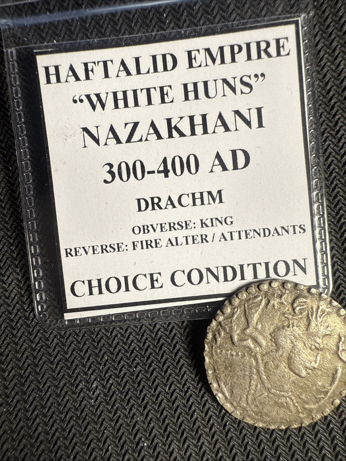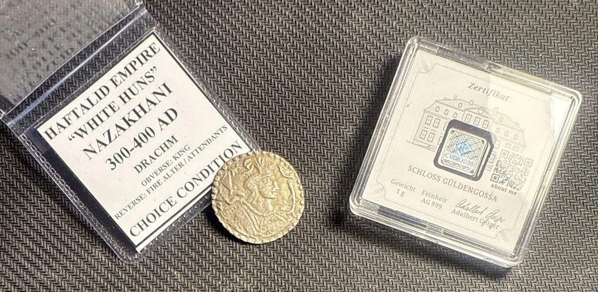 The product is a Silver Drachma coin from the Haftalid Empire, accompanied by a 1 gram Geiger Bar with a hologram. The coins are made of silver and are from Greece and Germany. They are uncertified, adding to their unique and collectible value. This item offers a piece of history from the ancient empire and a modern twist with the hologram bar, making it a fascinating addition to any coin collection.